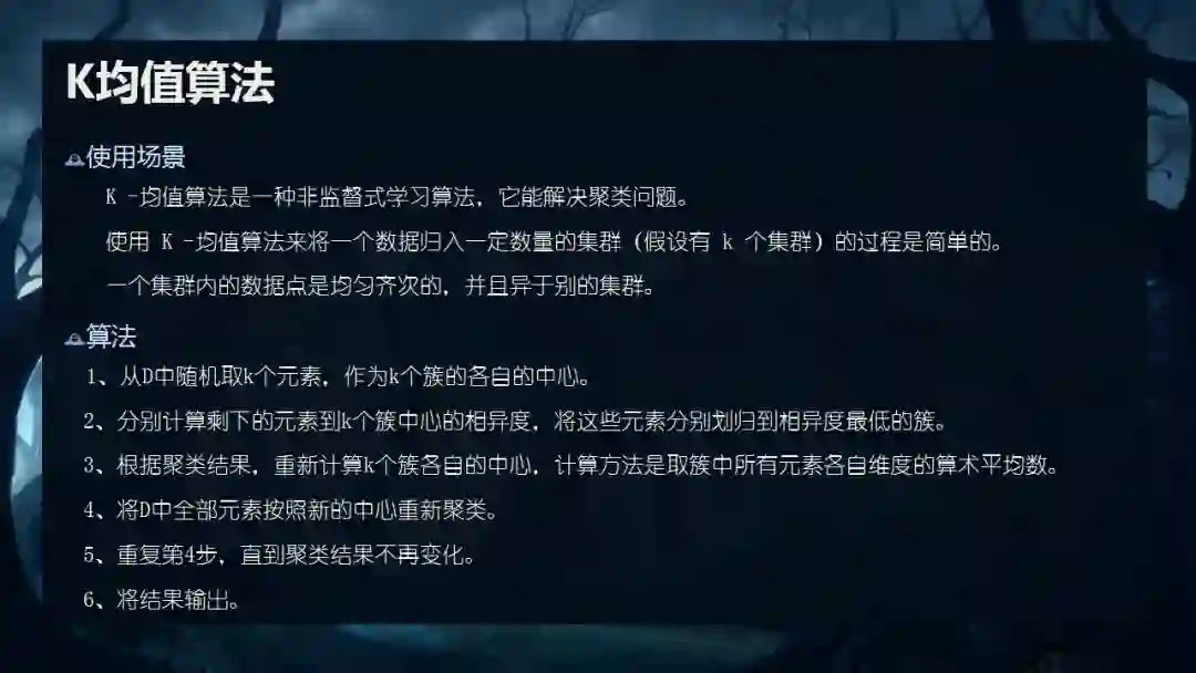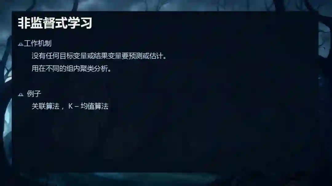 无监督学习算法 (Unsupervised Algorithms):这类算法没有特定的目标输出,算法将数据集分为不同的组。