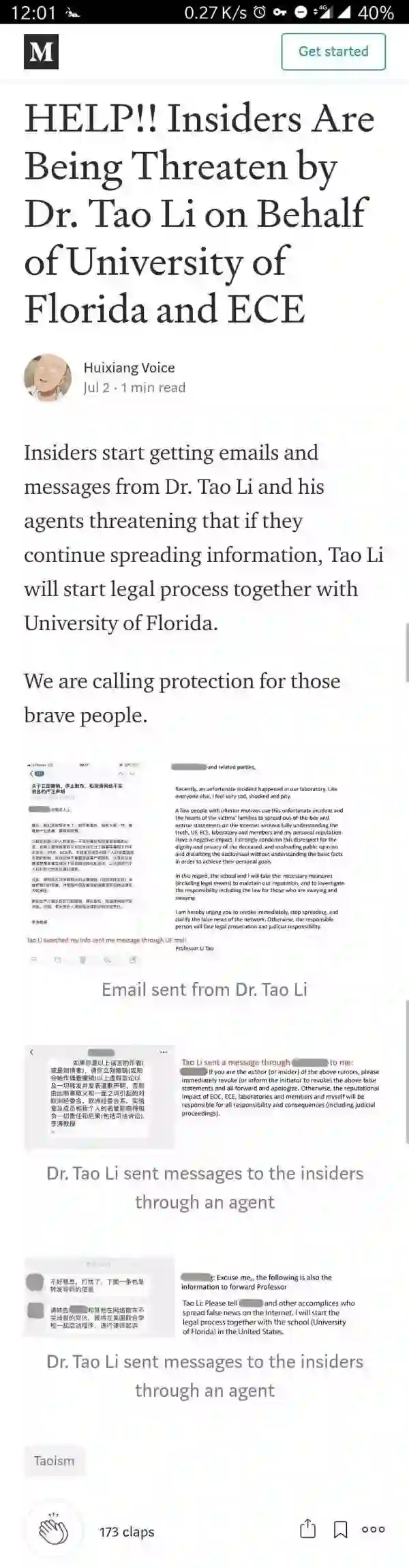 7 月 2 日,Huixiang's Voice 发布第二篇文章,称李涛已通过邮件联系账号所有者,并表示“严正要求你们立即撤销、停止散布,和澄清网络不实消息,否则,有关责任人将面临法律起诉和司法责任”。
