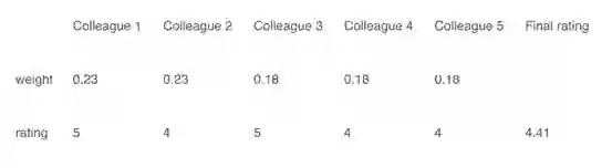 计算结果为[(5 * 0.23)+(4 * 0.23)+(5 * 0.18)+(4 * 0.18)+(4 * 0.18)] = 4.41。