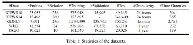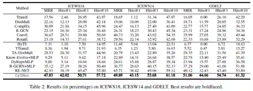 最后,研究者在 ICEWS18、ICEWS14、GDELT、WIKI 和 YAGO 等 5 个公开 TKG 基准数据集上进行了广泛的实验,结果表明 CyGNet 在未来事实(链接)预测任务上优于以往 SOTA TKG 模型。