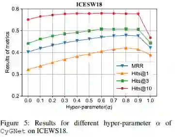 以 ICEWS18 为例,研究者分析了调整复制模式和生成模式权重的参数 alpha。实验结果证明 CyGNet 能有效的结合生成模式和复制模式。