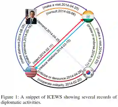知识图谱在知识驱动的信息检索、自然语言理解和推荐系统领域有着广泛的应用。一个知识图谱只拥有静态某一时刻的事实,而目前快速增长的数据往往表现出复杂的时间动态,即时序知识图谱(TKG)。具有代表性的时序知识图谱包括全球事件、语言和音调数据库(Global Database of Events, Language, and Tone, GDELT)和综合危机预警系统(Integrated Crisis Early Warning System, ICEWS)。下图 1 展示了 ICEWS 系统的一个外交活动记录子图。