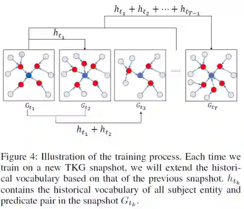 在训练过程中,研究者按照时间顺序依次训练每个时间片的知识图谱。每训练一个新的时间片的知识图谱,他们都会将该时间片之前的所有历史重复事实加入到历史词汇表,如下图 4 所示(验证和测试的时候,研究者使用整个训练集的历史信息)。