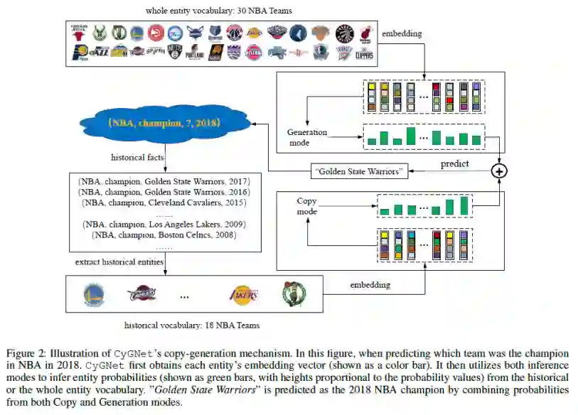 可以看到,当预测 2018 年哪支球队获得了总冠军时,我们可以从历史得知一共有 18 支 NBA 球队曾经获得过冠军。CyGNet 首先获得每个实体的嵌入向量(见彩色柱),然后使用生成模式(generation mode)得到所有 30 支 NBA 球队获得冠军的概率(见绿色条形,条形越高表示概率越大),同时使用复制模式得到所有曾经得到过冠军的 18 支球队的概率。通过合并两个模块得到的概率,CyGNet最终预测「金州勇士(Golden State Warriors)」能够获得 2018 年 NBA 冠军。