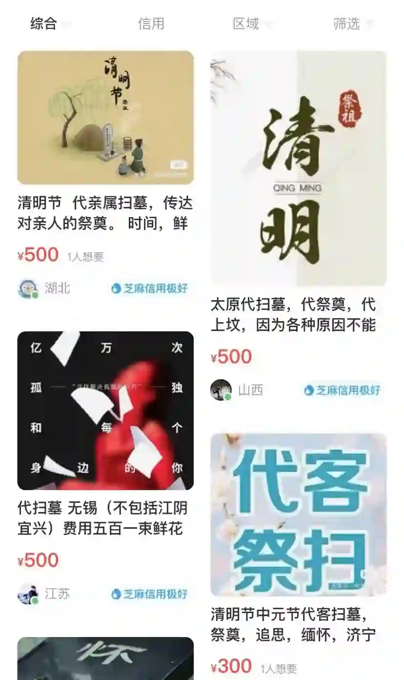 在淘宝、闲鱼等交易平台上都可以看到很多代祭祀的帖子,“清明节代扫墓、擦拭墓碑、清理杂草、上香献果、播放宗教乐曲”“水果糕点+100元,其他物品可议价”“磕头+2000元”“全年接受预约,支持私人订制”……代扫墓的范围均以自己所在的城市以及周边作为服务范围,价钱也是200元-1000元不等。提供服务的个人不少,但是其成交量都不高。