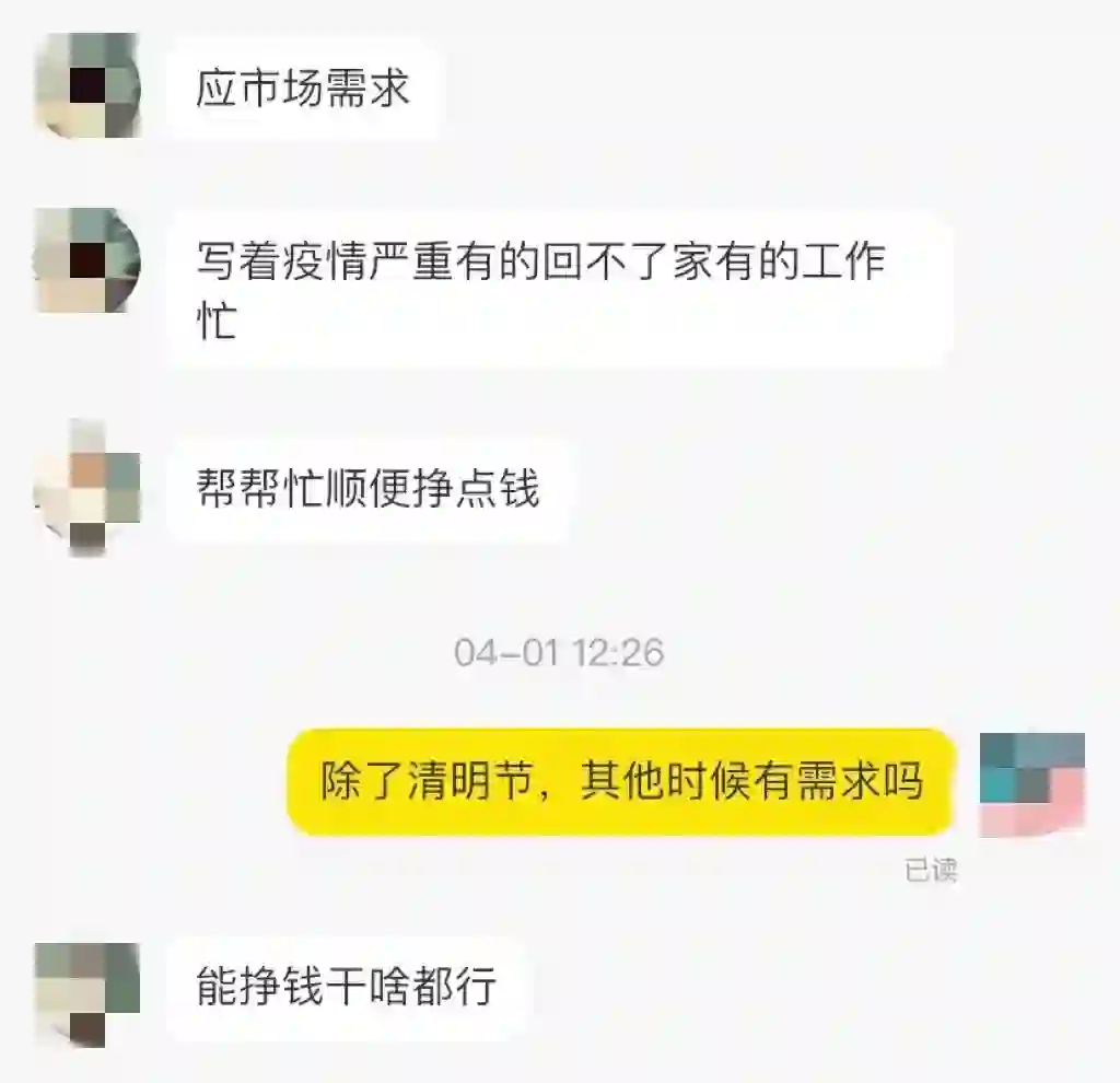 相较于公墓和专业机构,个人提供这项服务的门槛很低,大多数个人卖家考虑到的是“顺便整个钱”,有提供这项服务的个人卖家表示,“能挣钱干啥都行”。