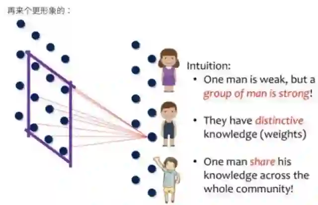 每个人代表一个卷积核来进行提取不同的特征,一个人是弱小的,但是一组人就强大了,他们有着不同的知识(权重),这样类比来理解,就会好理解很多。