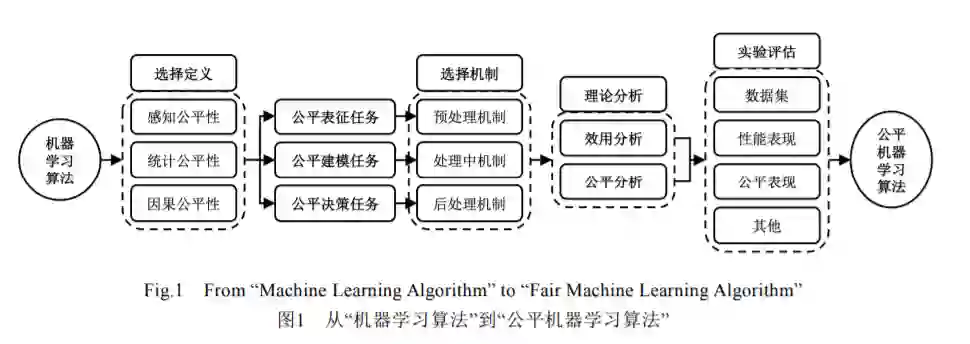 在政府机构指导性原则引导下,学术界和产业界正着力推动公平机器学习理论、技术及应用发展.本文的 主旨是梳理目前机器学习公平性研究的现状,并为后续研究提供可借鉴的思路.机器学习算法通常包括以下关 键环节:数据所有者采集数据,模型提供者设计算法,算法使用者运行并做出决策.公平机器学习研究的关键问 题是如何建立以法律、伦理、社会学为引导的公平性定义,以及如何设计公平性定义驱动的公平机器学习算 法.图 1总体介绍公平机器学习算法设计流程框架.首先,明确公平目标,即确定符合应用需求的公平性目标,常用 的公平性目标包括感知公平性、统计公平性和因果公平性.其次,明确公平任务,即确定面向公平目标的算法公 平性提升任务,包括公平表征任务、公平建模任务和公平决策任务.公平表征任务旨在建立公平数据集或提取 公平数据特征;公平建模任务旨在建立公平机器学习模型;而公平决策任务将机器学习模型视为黑盒模型,旨在 利用其输出结果进行公平决策.处理机制的选择通常对应机器学习算法关键环节,具体包括预处理机制、处理 中机制和后处理机制.最后,从理论分析和实验评估两个角度分别验证公平机器学习的表现.本文的主要贡献如 下:明确公平机器学习算法设计流程框架,形式化公平性定义,给出公平性定义的分类体系,总结并综述三类公 平性任务,系统性梳理未来研究方向,有助于指导后续研究者针对公平性理论的研究和探索.本文的框架组织如 下:第1章列举算法不公平产生的危害,探讨造成该现象的潜在原因,提供消除算法偏差的机制;第0章提取机器 学习中公平性定义的抽象模型,比较现有机器学习的公平性定义;第0章详述解决公平表征任务、公平建模任 务和公平决策任务的具体方法;第4章举例说明公平机器学习的应用,并列举供研究的数据集和检测工具;第5章 指出公平机器学习的研究问题及其面临的挑战;第6章对全文进行总结.