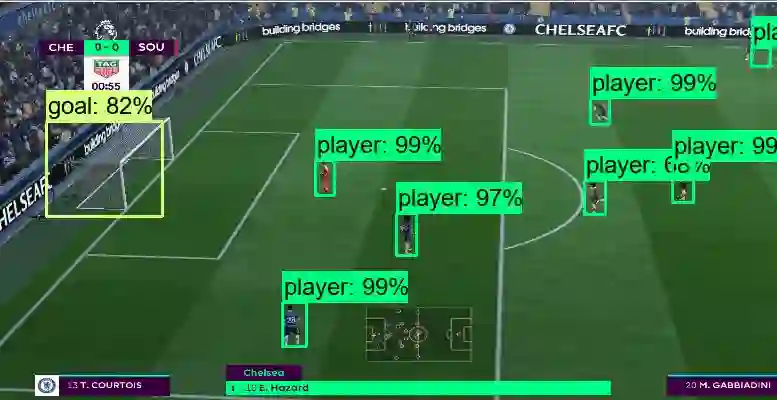 为了令智能体能理解输入图像,我们使用了一个非常紧凑的轻量级卷积网络,即 MobileNet。该网络抽取的特征图表征了智能体对图像的高级语义理解,例如理解球员和其它目标在图像中的位置。特征图随后会与单次多目标检测器一起检测球场上的球员、球与球门。