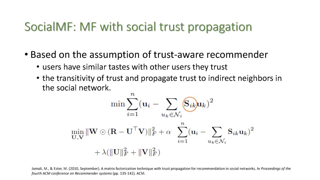 Jamali, M., & Ester, M. (2010, September). A matrix factorization technique with trust propagation for recommendation in social networks. In Proceedings of the fourth ACM conference on Recommender systems (pp. 135-142). ACM.