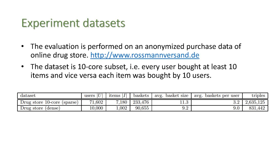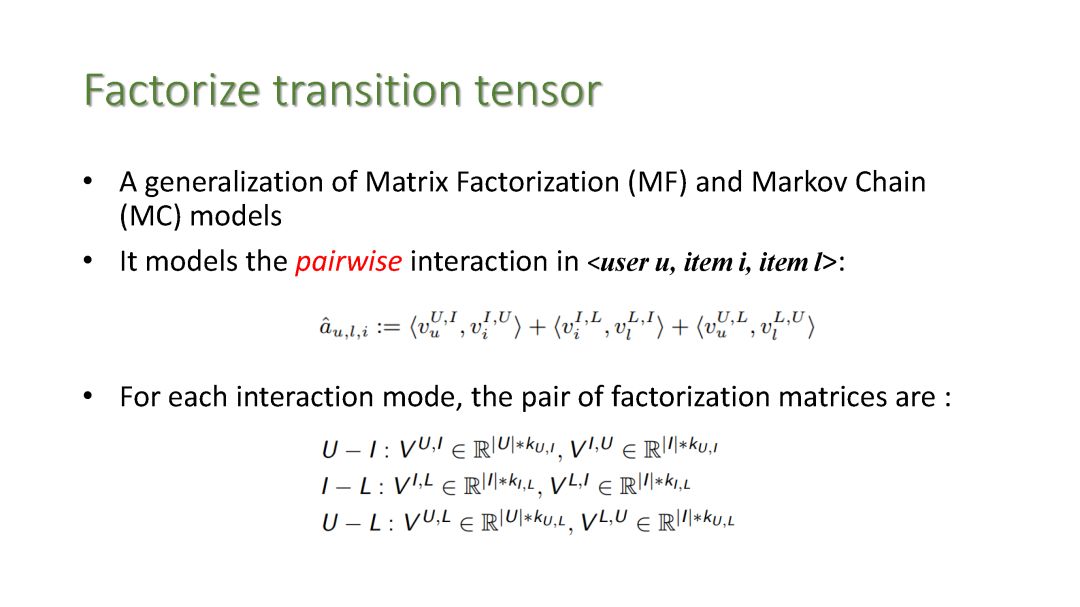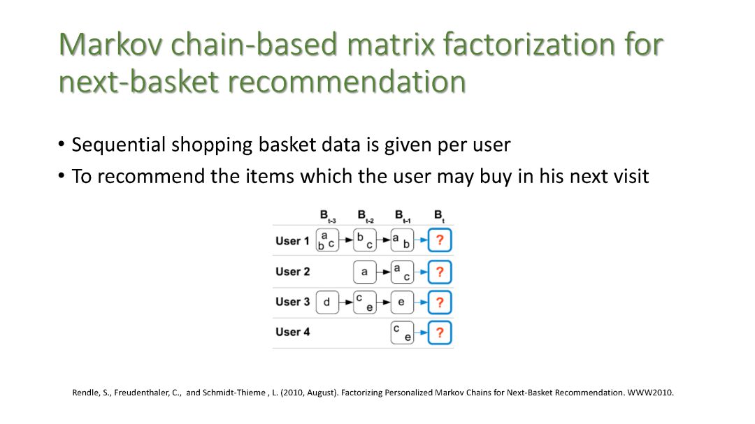 Rendle, S., Freudenthaler, C., and Schmidt-Thieme , L. (2010, August). Factorizing Personalized Markov Chains for Next-Basket Recommendation. WWW2010.