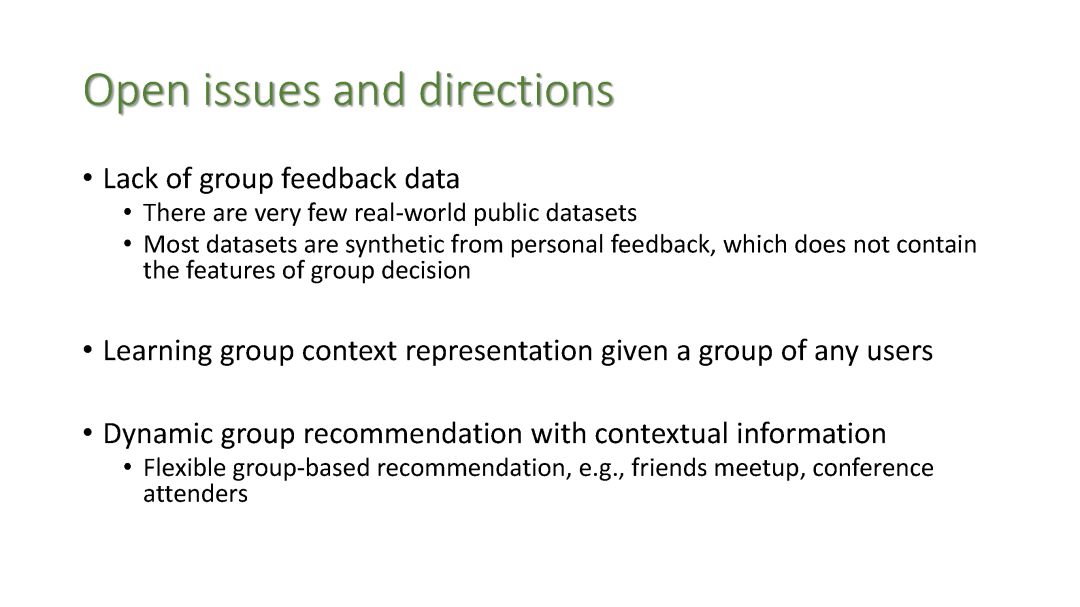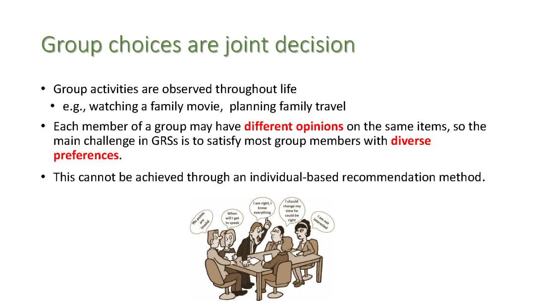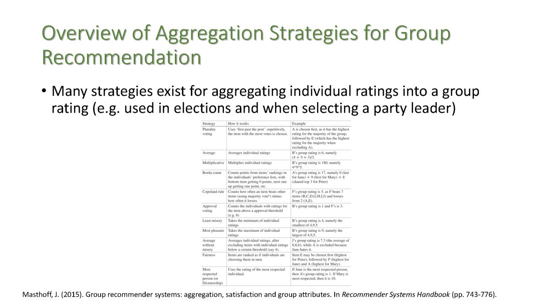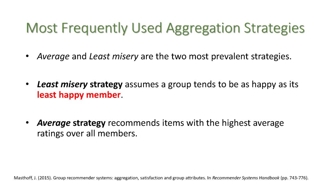 Masthoff, J. (2015). Group recommender systems: aggregation, satisfaction and group attributes. In Recommender Systems Handbook (pp. 743-776). Springer US.