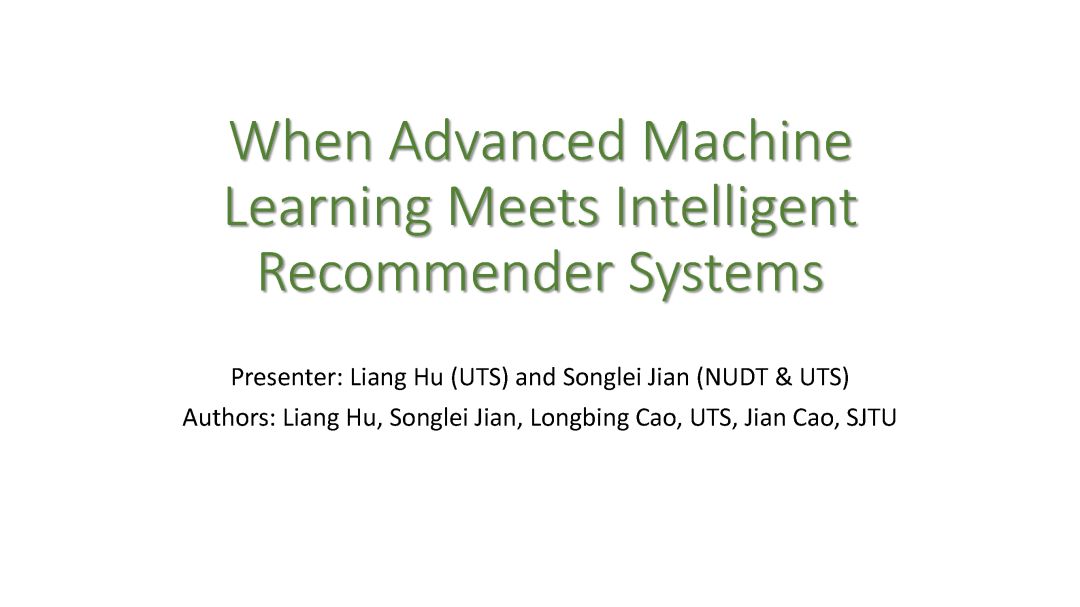 【导读】第32届AAAI大会-AAAI 2018将于2月2号-7号在美国新奥尔良召开,悉尼科技大学Liang Hu博士即将在大会作报告“When Advanced Machine Learning Meets Intelligent Recommender Systems” ,主要教读者如何用最前沿的机器学习算法实现智能推荐系统。主要内容包括但不局限于:推荐系统的发展进程、如何用机器学习方法建模异构数据、在推荐系统中使用前沿的机器学习算法、构建先进的推荐系统等。文章对推荐算法的总结较为全面,并介绍最新的技术方法,如果您对推荐系统感兴趣,我们建议您关注大会的日常以及Liang Hu博士精彩的分享。专知内容组整理出他放出的PPT内容,欢迎大家查看。