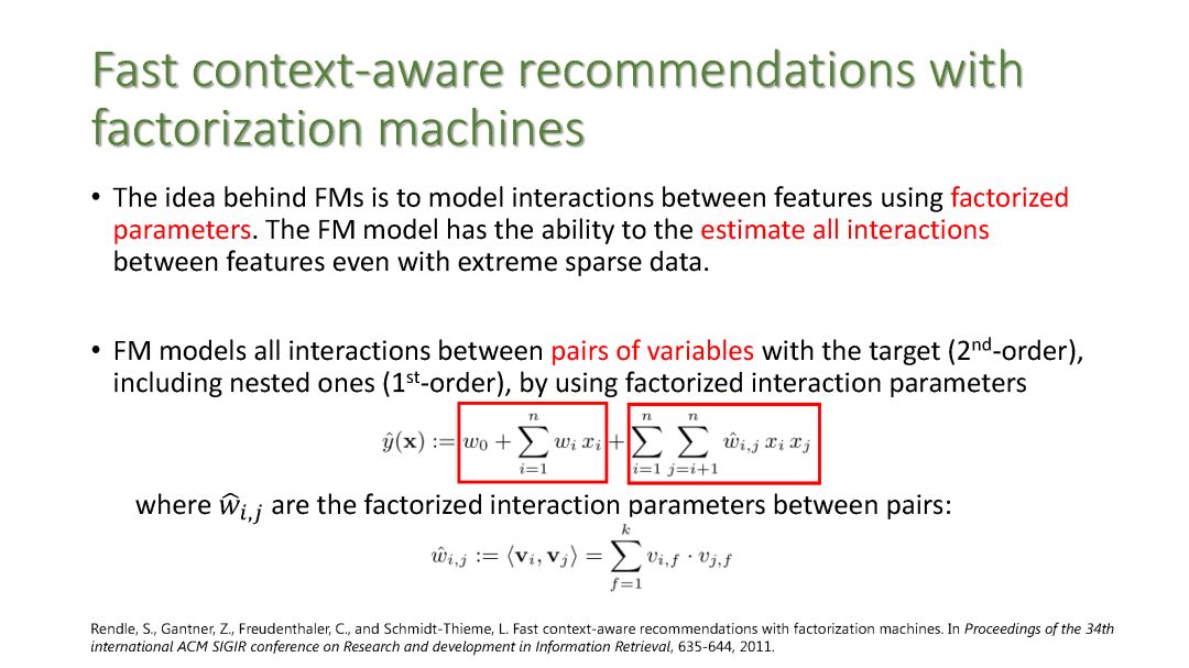 Rendle, S., Gantner, Z., Freudenthaler, C., & Schmidt-Thieme, L. (2011, July). Fast context-aware recommendations with factorization machines. In Proceedings of the 34th international ACM SIGIR conference on Research and development in Information Retrieval (pp. 635-644). ACM.