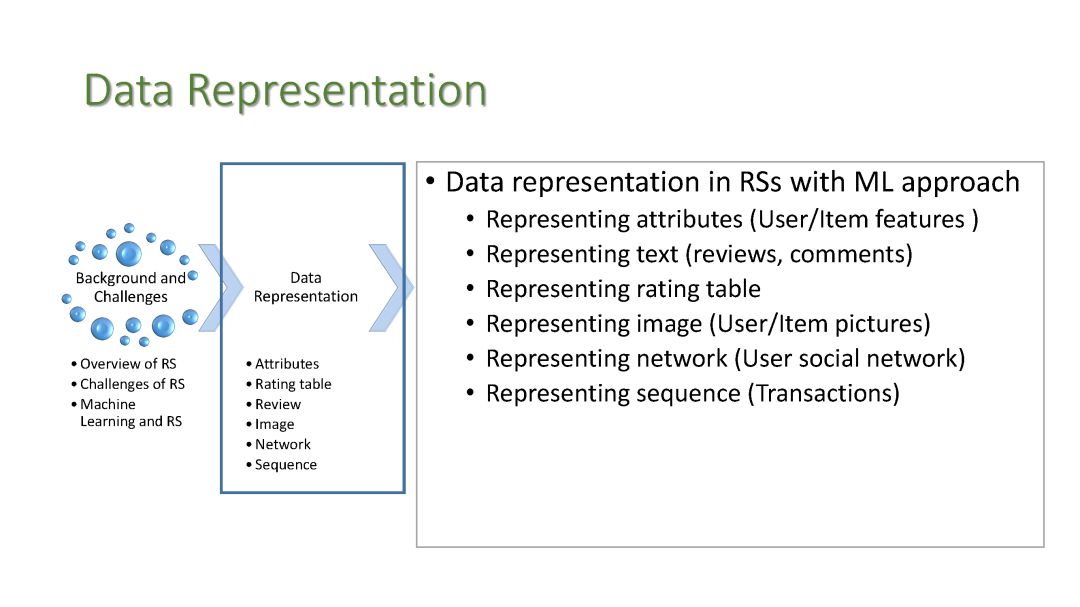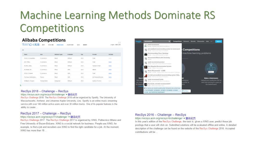 值得一提的是,推荐系统(RS),可能是最广泛使用的AI系统之一,它已经融入到我们日常生活的各个部分。 在AI时代,最前沿的机器学习方法,如深度学习,已经成为构建推荐系统的首选。 目前的机器学习方法是建立在数据的基础之上的,因此推荐任务可以看作这样一类问题:从数据中学习和推断。