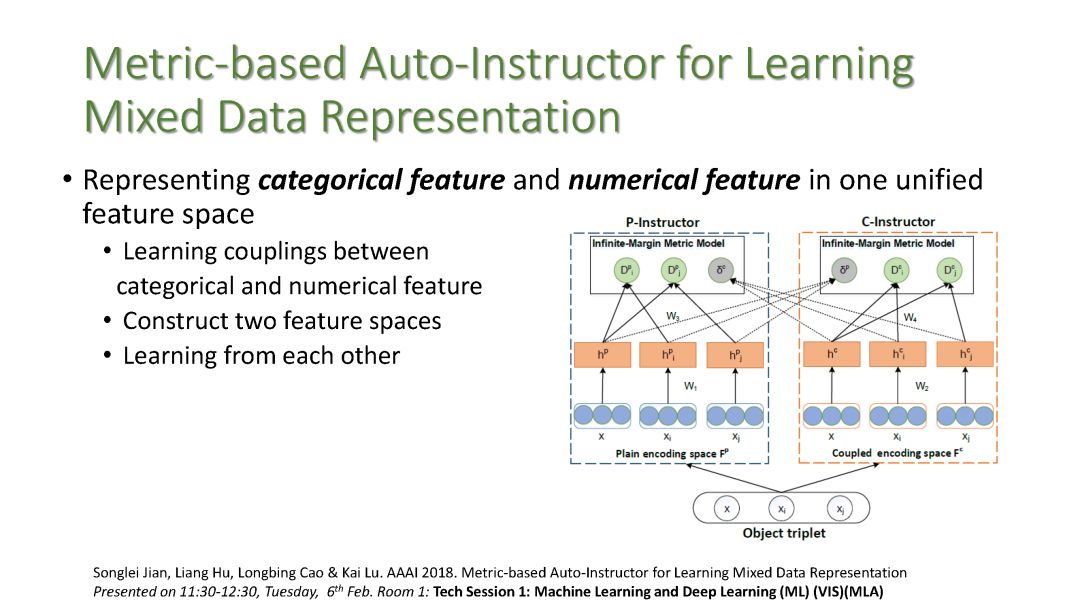 Jian, S, Hu, L, Cao, L & Lu, K. AAAI 2018. Metric-based Auto-Instructor for Learning Mixed Data Representation