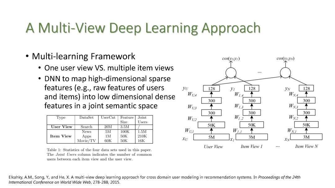 Elkahky, A.M., Song, Y., and He, X. A multi-view deep learning approach for cross domain user modeling in recommendation systems. In Proceedings of the 24th International Conference on World Wide Web, 278-288, 2015.