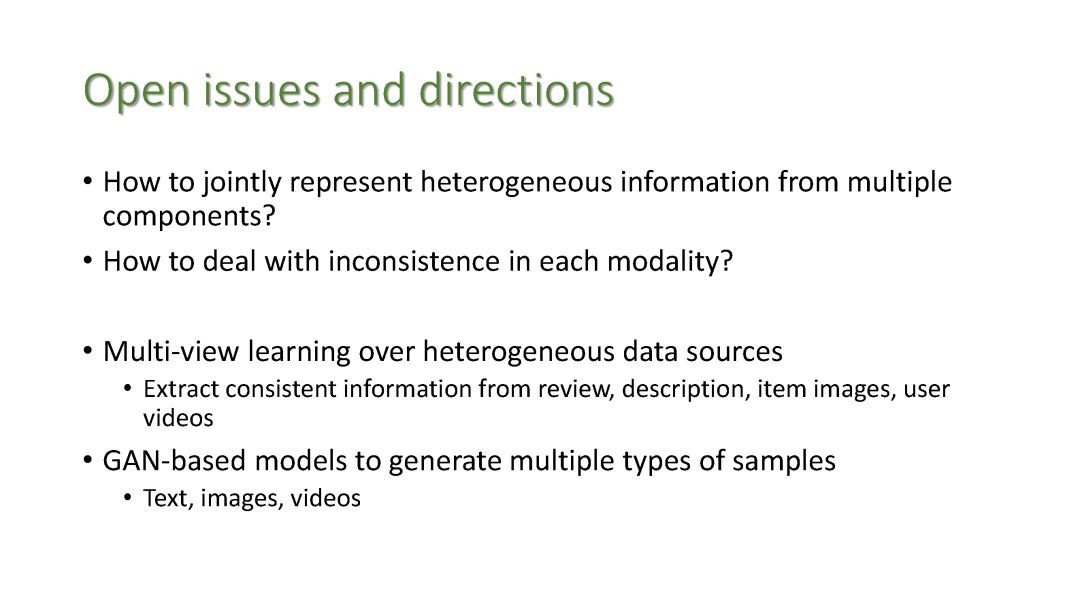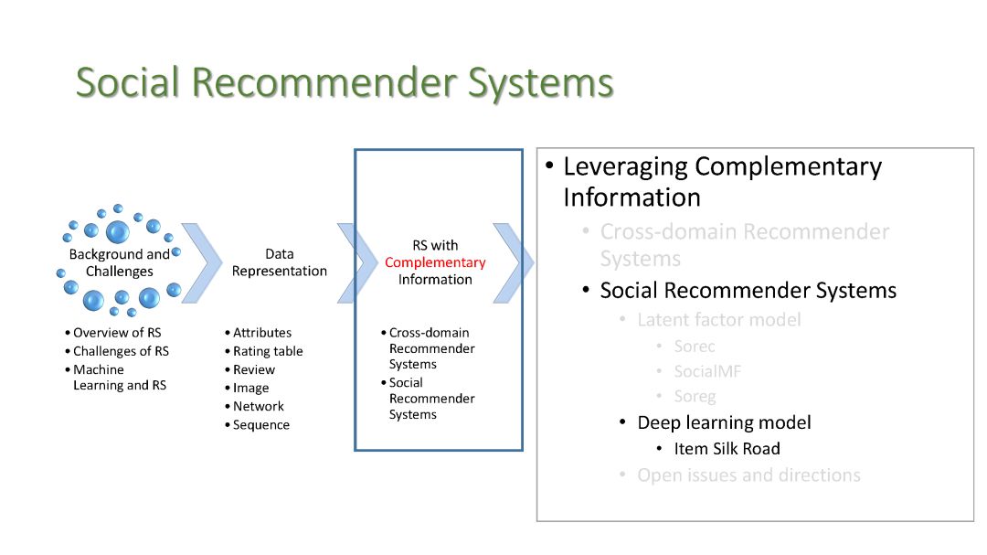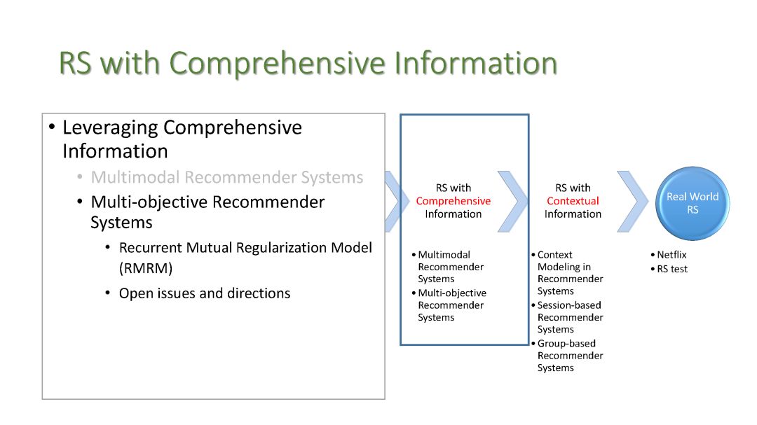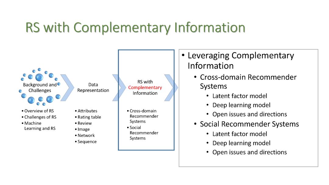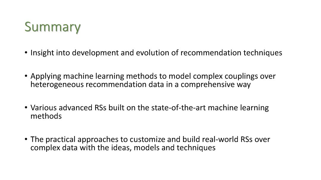 传统RS是基于相关数据,如评论,内容和/或社会关系,是独立同分布(IID)。 直观地说,这与现实生活中的数据特征不一致,不能代表相关数据的异质性和耦合关系。 因此,我们采用前沿机器学习的方法,通过耦合相关的异构数据来提高互补性,全面性和上下文(3C)信息的RS。 本教程将分析前沿推荐问题中的数据、挑战和业务需求,并采用非IID视角介绍机器学习方面的最新进展,建模基于上下文(3C)的下一代推荐系统(RS)。 包括RS发展综述和非IID推荐系统,跨域RS,社交RS,多模式RS,多标准RS,情境感知RS和基于分组的RS的高级机器学习,以及将它们组合构成真实的推荐系统。