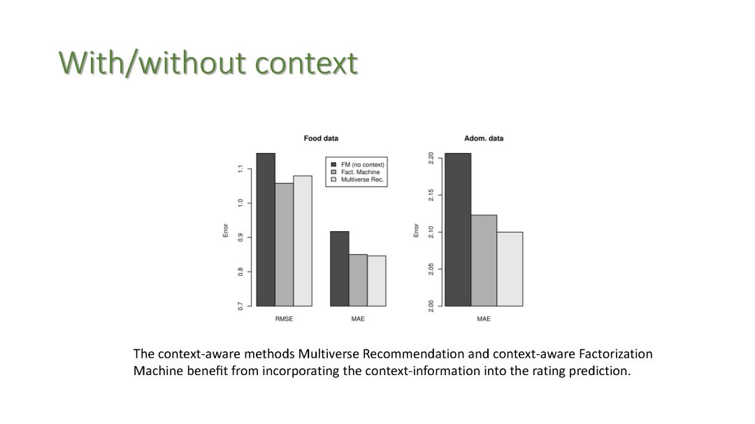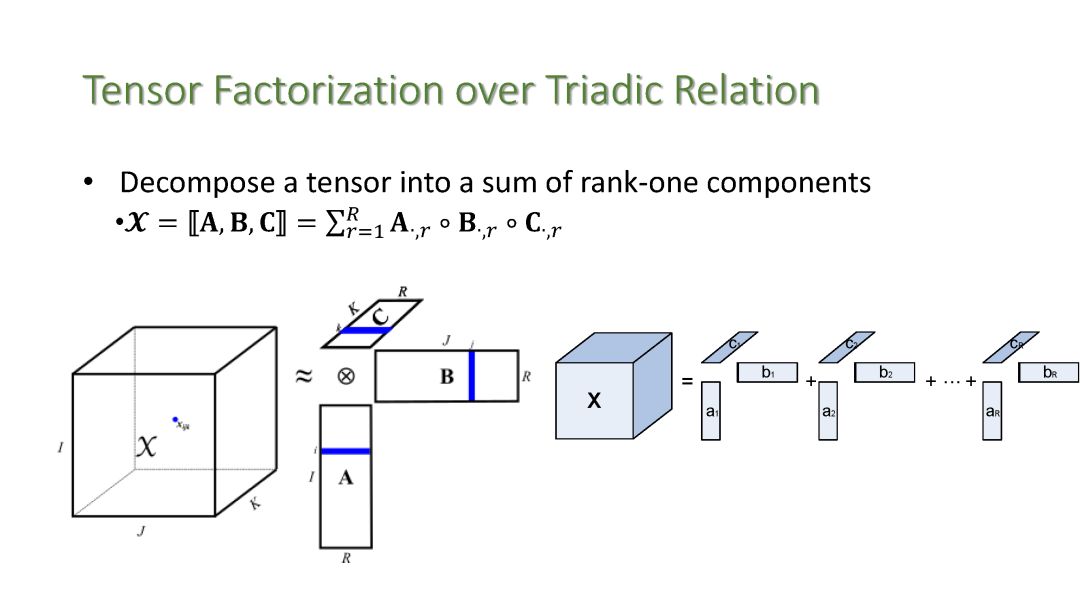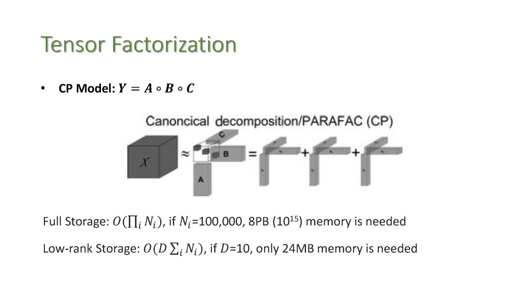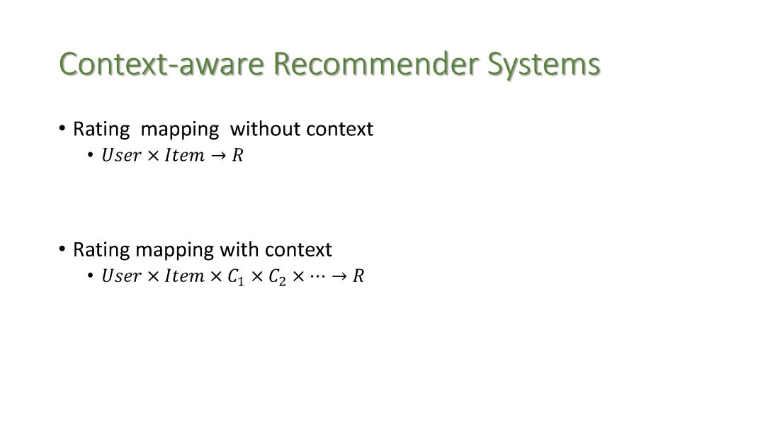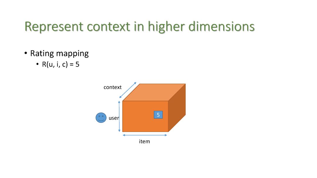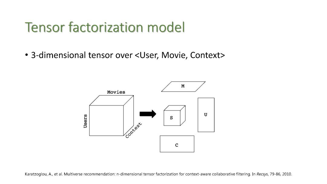 Karatzoglou, A., Amatriain, X., Baltrunas, L., & Oliver, N. (2010, September). Multiverse recommendation: n-dimensional tensor factorization for context-aware collaborative filtering. In Proceedings of the fourth ACM conference on Recommender systems (pp. 79-86). ACM.