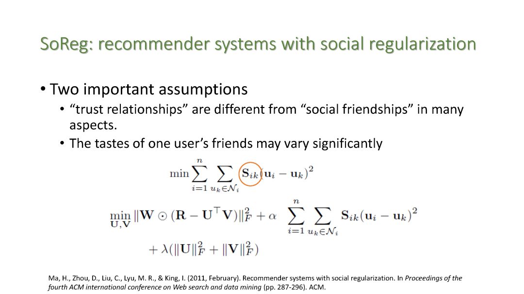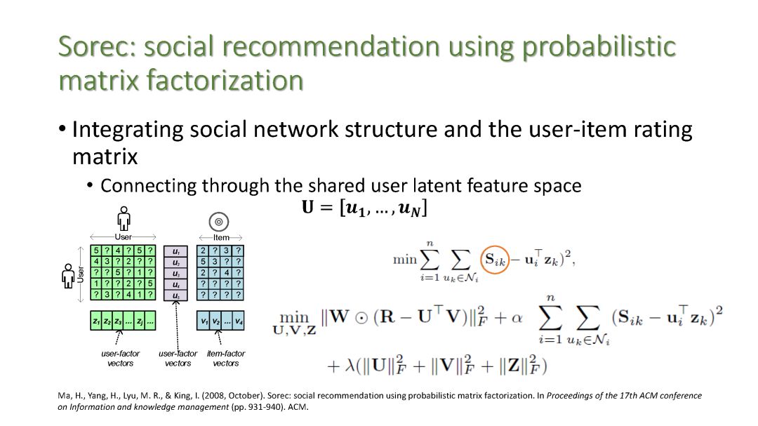 Ma, H., Yang, H., Lyu, M. R., & King, I. (2008, October). Sorec: social recommendation using probabilistic matrix factorization. In Proceedings of the 17th ACM conference on Information and knowledge management (pp. 931-940). ACM.