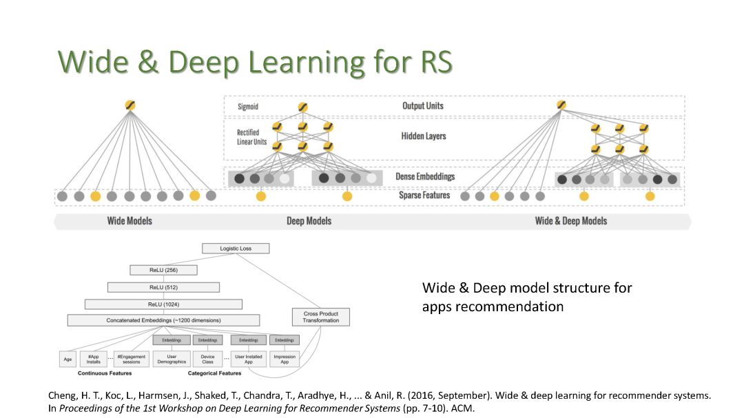 Cheng, H. T., Koc, L., Harmsen, J., Shaked, T., Chandra, T., Aradhye, H., ... & Anil, R. (2016, September). Wide & deep learning for recommender systems. In Proceedings of the 1st Workshop on Deep Learning for Recommender Systems (pp. 7-10). ACM.
