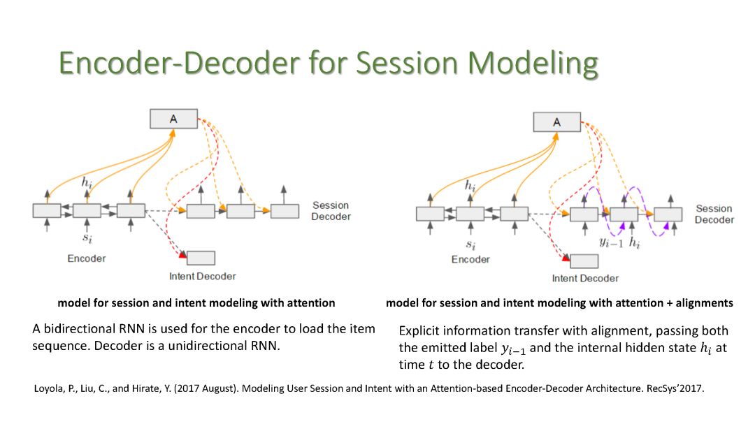 Loyola, P., Liu, C., and Hirate, Y. (2017 August). Modeling User Session and Intent with an Attention-based Encoder-Decoder Architecture. RecSys’2017.