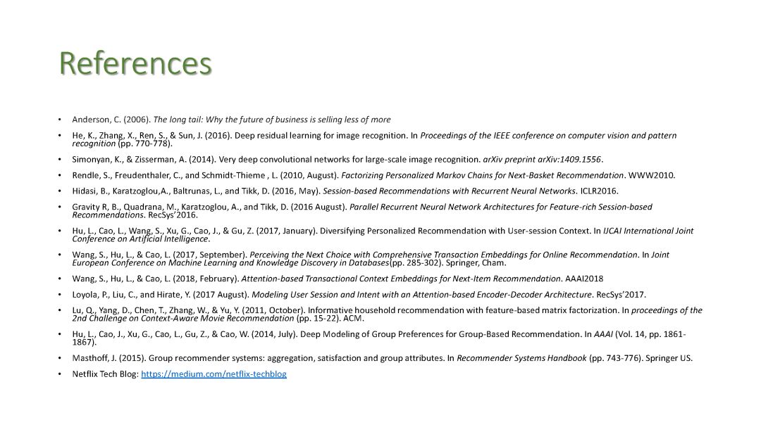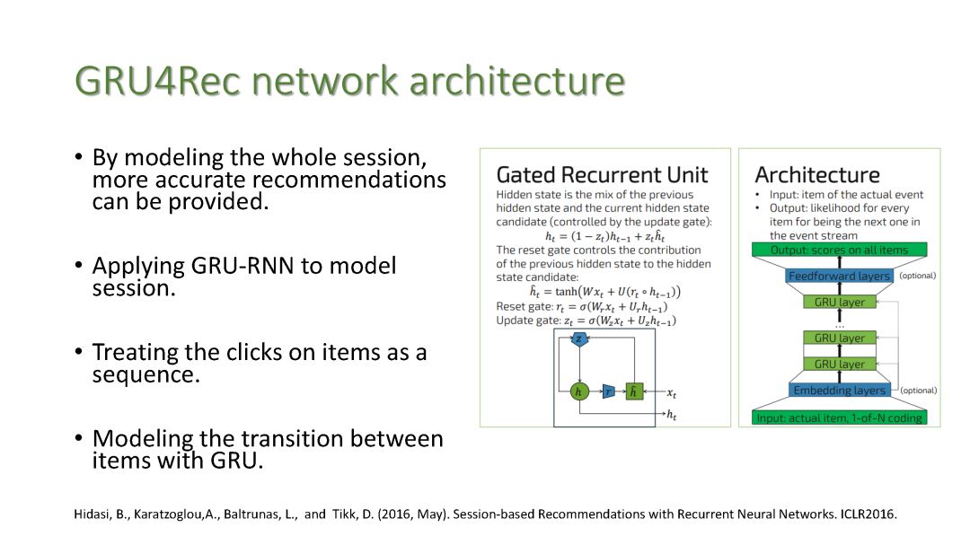 Hidasi, B., Karatzoglou,A., Baltrunas, L., and Tikk, D. (2016, May). Session-based Recommendations with Recurrent Neural Networks. ICLR2016.