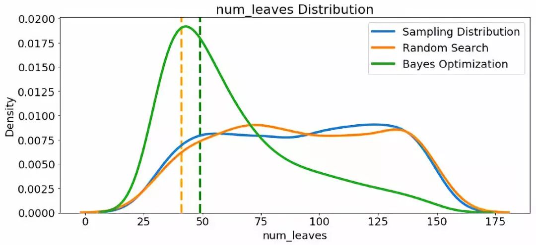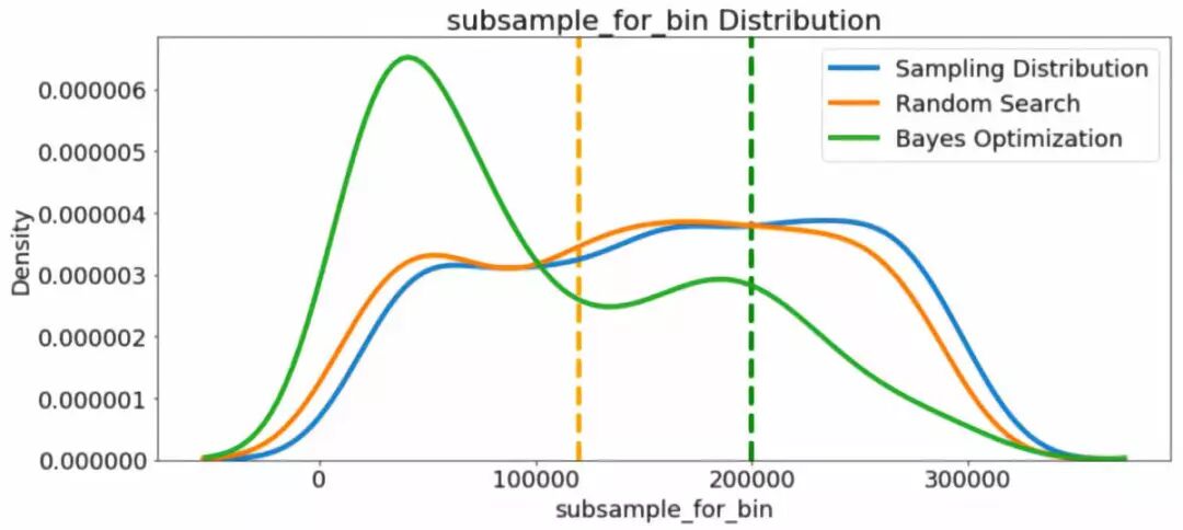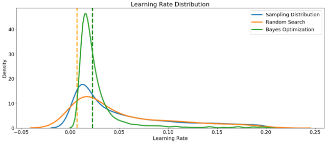 首先,我们可以制作随机搜索和贝叶斯优化中采样的learning_rate的核密度估计图。作为参考,我们还可以显示采样分布。垂直虚线表示学习率的最佳值(根据交叉验证)。