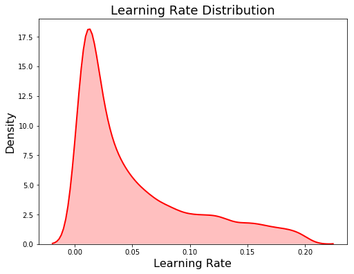 我们将学习率定义为0.005到0.2之间的对数正态,贝叶斯优化结果看起来与采样分布类似。 这告诉我们,我们定义的分布看起来适合于任务,尽管最佳值比我们放置最大概率的值略高。 这可用于告诉域进一步搜索。