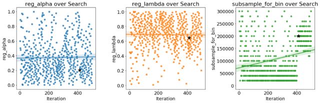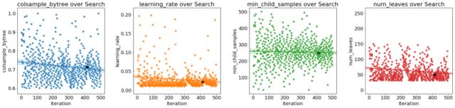 黑星表示最佳值。 colsamplebytree和learningrate会随着时间的推移而减少,这可能会指导我们未来的搜索。