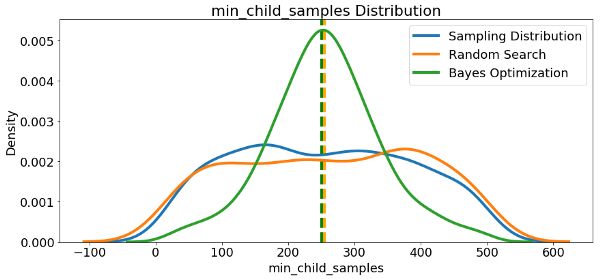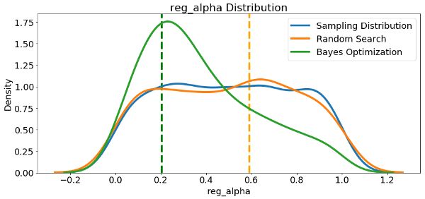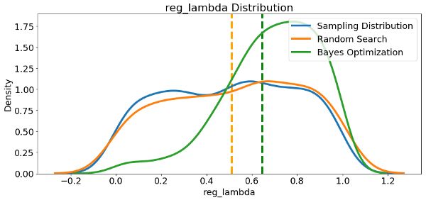 由于我们有它们,让我们看看参考分布,随机搜索和贝叶斯优化中的所有数字超参数。 垂直线再次表示每次搜索的超参数的最佳值: