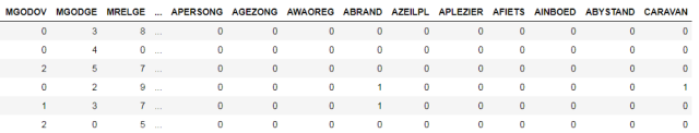 在本例中,我们将使用Caravan Insurance数据集,其目标是预测客户是否购买保险单。 这是一个有监督分类问题,训练集和测试集的大小分别为5800和4000。评估性能的指标是AUC(曲线下面积)评估准则和ROC(receiver operating characteristic,以真阳率和假阳率为坐标轴的曲线图)曲线,ROC AUC越高表示模型越好。 数据集如下所示: