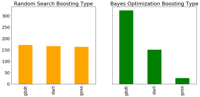 另一个超参数是增强类型,在随机搜索和贝叶斯优化期间评估每种类型的条形图。 由于随机搜索不关注过去的结果,我们预计每种增强类型的使用次数大致相同。