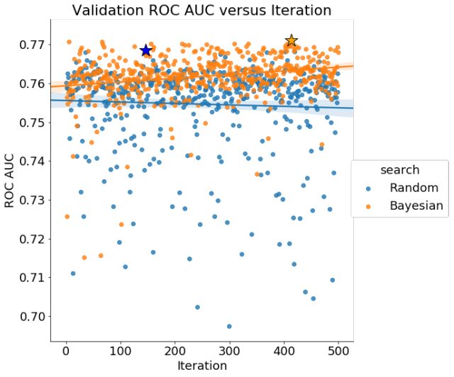 来自贝叶斯超参数优化的验证集上的分数随着时间的推移而增加,表明该方法正在尝试“更好”的超参数值(应该注意,仅根据验证集上的表现更好)。随机搜索没有显示迭代的改进。