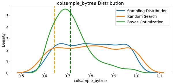 在大多数情况下(subsampleforbin除外),贝叶斯优化搜索倾向于在超参数值附近集中(放置更多概率),从而产生交叉验证中的最低损失。这显示了使用贝叶斯方法进行超参数调整的基本思想:花费更多时间来评估有希望的超参数值。