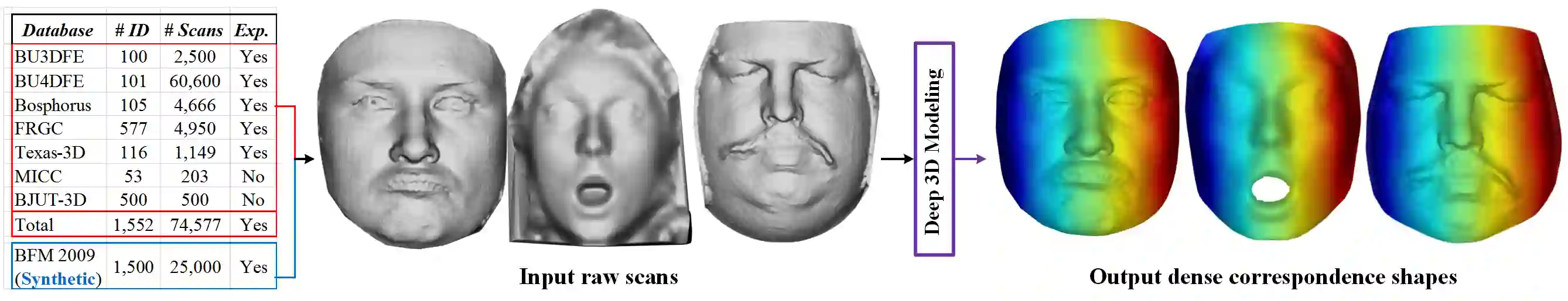 Traditional 3D models learn a latent representation of faces using linear subspaces from no more than 300 training scans of a single database. The main roadblock of building a large-scale face model from diverse 3D databases lies in the lack of dense correspondence among raw scans. To address these problems, this paper proposes an innovative framework to jointly learn a nonlinear face model from a diverse set of raw 3D scan databases and establish dense point-to-point correspondence among their scans. Specifically, by treating input raw scans as unorganized point clouds, we explore the use of PointNet architectures for converting point clouds to identity and expression feature representations, from which the decoder networks recover their 3D face shapes. Further, we propose a weakly supervised learning approach that does not require correspondence label for the scans. We demonstrate the superior dense correspondence and representation power of our proposed method in shape and expression, and its contribution to single-image 3D face reconstruction.