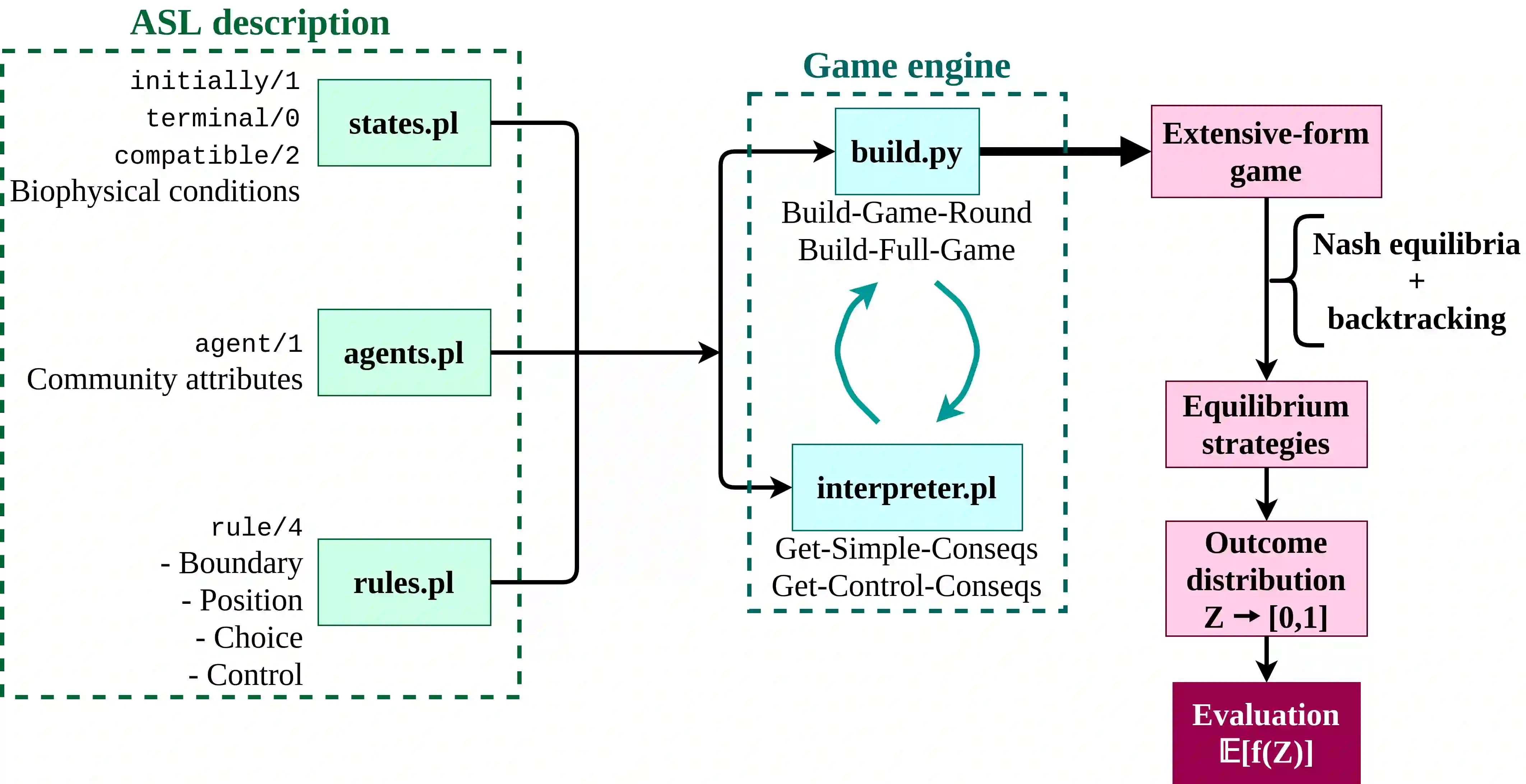 翻译:机构分析和发展框架(IAD)是Elinor Ostrom及其同事提出的一个概念工具箱,目的是确定和界定构成人类互动千差万别结构的普遍共同变量。框架将规则确定为确定互动结构的核心概念之一,并承认其有潜力引导社区实现更有益、更可取的社会理想成果。这项工作首次尝试将IAD框架转化为计算模型,使代理群体能够正式进行对特定规则配置的如果分析。为此,我们界定了行动状况语言 -- -- 或ASL -- -- 其语法几乎适合IAD框架的构成部分,并用于描述社会互动。ASL得到一个游戏引擎的补充,该游戏引擎生成其语义作为广泛的游戏。然后,这些模型可以使用标准游戏理论工具进行分析,以预测哪些成果最受激励,并根据其社会相关特性进行评估。