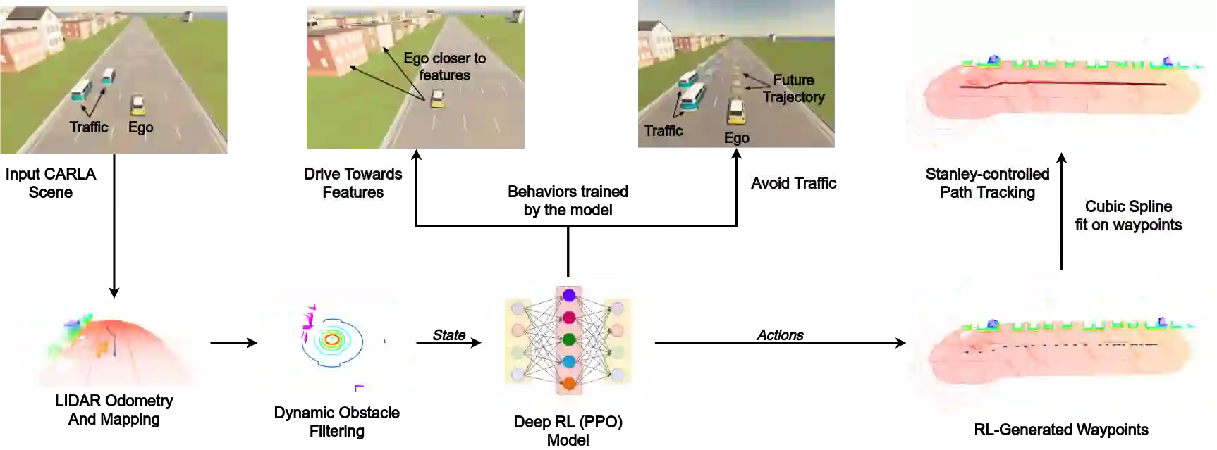 翻译:我们着手处理一个迄今未报告的自主机器人(自驾驶车)在动态场景中航行的问题,以减少其定位错误和最终的累积性漂移或绝对轨迹错误,这在动态场景中已经显露出来。以极受欢迎的Velodyne-16 3D LIDAR作为主要感知模式,以及精确的LIDAR定位和绘图算法,作为国家估计框架,LOAM显示,在没有导航政策的情况下,在移动物体面前迅速漂移。要克服这一点,我们通过一套适当的奖赏和惩罚功能,学习导致漂移最小化的导航的行动。我们使用一种深强化学习方法,即Proximal政策优化,以学习导致漂移最小化轨迹的行动。我们通过对通过CARLA模拟器提供的合成的、但具有照片现实性的场景进行广泛比较,展示了拟议框架优于不采用这种政策的方法的优异性。