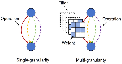Differentiable architecture search (DAS) has become the prominent approach in the field of neural architecture search (NAS) due to its time-efficient automation of neural network design. It shifts the traditional paradigm of discrete architecture sampling and evaluation to differentiable super-net optimization and discretization. However, existing DAS methods either only conduct coarse-grained operation-level search, or restrictively explore fine-grained filter-level and weight-level units using manually-defined remaining ratios, which fail to simultaneously achieve small model size and satisfactory model performance. Additionally, they address the high memory consumption of the search process at the expense of search quality. To tackle these issues, we introduce multi-granularity architecture search (MGAS), a unified framework which aims to comprehensively and memory-efficiently explore the multi-granularity search space to discover both effective and efficient neural networks. Specifically, we learn discretization functions specific to each granularity level to adaptively determine the remaining ratios according to the evolving architecture. This ensures an optimal balance among units of different granularity levels for different target model sizes. Considering the memory demands, we break down the super-net optimization and discretization into multiple sub-net stages. By allowing re-pruning and regrowing of units in previous sub-nets during subsequent stages, we compensate for potential bias in earlier stages. Extensive experiments on CIFAR-10, CIFAR-100 and ImageNet demonstrate that MGAS outperforms other state-of-the-art methods in achieving a better trade-off between model performance and model size.