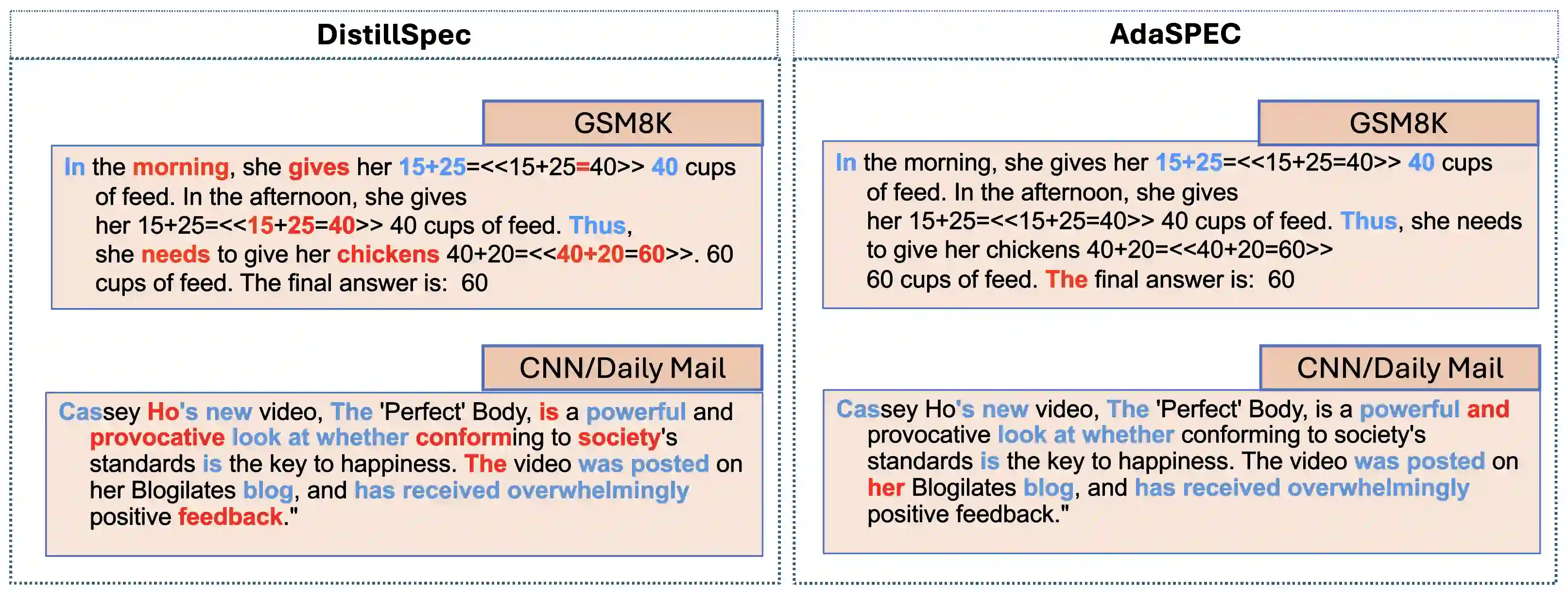 翻译:推测解码(Speculative Decoding,SD)通过采用一个小型草稿模型生成预测,再由一个更大的目标模型进行验证,从而加速大语言模型的推理过程。SD的有效性取决于这两个模型之间的对齐程度,通常通过知识蒸馏(Knowledge Distillation,KD)来增强。然而,传统的KD方法旨在最小化草稿模型与目标模型在所有词元上的KL散度,这一目标与SD的真实目标——最大化词元接受率——并不一致。因此,由于容量限制,草稿模型往往难以完全吸收目标模型的知识,导致性能欠佳。为解决这一挑战,我们提出了AdaSPEC,一种在KD过程中引入选择性词元过滤的新方法。AdaSPEC利用一个参考模型来识别并过滤难以拟合的词元,从而能够在更简单的词元上蒸馏出与目标模型对齐更好的草稿模型。该方法在不损害生成质量的前提下,提高了整体词元接受率。我们在包括算术推理、指令遵循、代码生成和文本摘要在内的多样化任务上评估了AdaSPEC,使用的模型参数配置为31M/1.4B和350M/2.7B。实验结果表明,AdaSPEC在所有任务上均持续优于当前最先进的DistillSpec方法,实现了更高的接受率(最高提升15%)。代码已在 https://github.com/yuezhouhu/adaspec 公开。