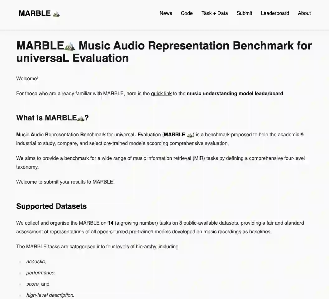 In the era of extensive intersection between art and Artificial Intelligence (AI), such as image generation and fiction co-creation, AI for music remains relatively nascent, particularly in music understanding. This is evident in the limited work on deep music representations, the scarcity of large-scale datasets, and the absence of a universal and community-driven benchmark. To address this issue, we introduce the Music Audio Representation Benchmark for universaL Evaluation, termed MARBLE. It aims to provide a benchmark for various Music Information Retrieval (MIR) tasks by defining a comprehensive taxonomy with four hierarchy levels, including acoustic, performance, score, and high-level description. We then establish a unified protocol based on 14 tasks on 8 public-available datasets, providing a fair and standard assessment of representations of all open-sourced pre-trained models developed on music recordings as baselines. Besides, MARBLE offers an easy-to-use, extendable, and reproducible suite for the community, with a clear statement on copyright issues on datasets. Results suggest recently proposed large-scale pre-trained musical language models perform the best in most tasks, with room for further improvement. The leaderboard and toolkit repository are published at https://marble-bm.shef.ac.uk to promote future music AI research.