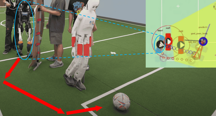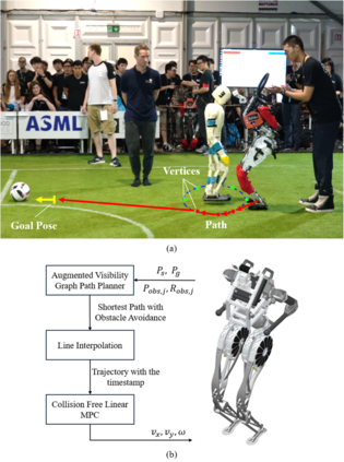 In this paper we detail the methods used for obstacle avoidance, path planning, and trajectory tracking that helped us win the adult-sized, autonomous humanoid soccer league in RoboCup 2024. Our team was undefeated for all seated matches and scored 45 goals over 6 games, winning the championship game 6 to 1. During the competition, a major challenge for collision avoidance was the measurement noise coming from bipedal locomotion and a limited field of view (FOV). Furthermore, obstacles would sporadically jump in and out of our planned trajectory. At times our estimator would place our robot inside a hard constraint. Any planner in this competition must also be be computationally efficient enough to re-plan and react in real time. This motivated our approach to trajectory generation and tracking. In many scenarios long-term and short-term planning is needed. To efficiently find a long-term general path that avoids all obstacles we developed DAVG (Dynamic Augmented Visibility Graphs). DAVG focuses on essential path planning by setting certain regions to be active based on obstacles and the desired goal pose. By augmenting the states in the graph, turning angles are considered, which is crucial for a large soccer playing robot as turning may be more costly. A trajectory is formed by linearly interpolating between discrete points generated by DAVG. A modified version of model predictive control (MPC) is used to then track this trajectory called cf-MPC (Collision-Free MPC). This ensures short-term planning. Without having to switch formulations cf-MPC takes into account the robot dynamics and collision free constraints. Without a hard switch the control input can smoothly transition in cases where the noise places our robot inside a constraint boundary. The nonlinear formulation runs at approximately 120 Hz, while the quadratic version achieves around 400 Hz.