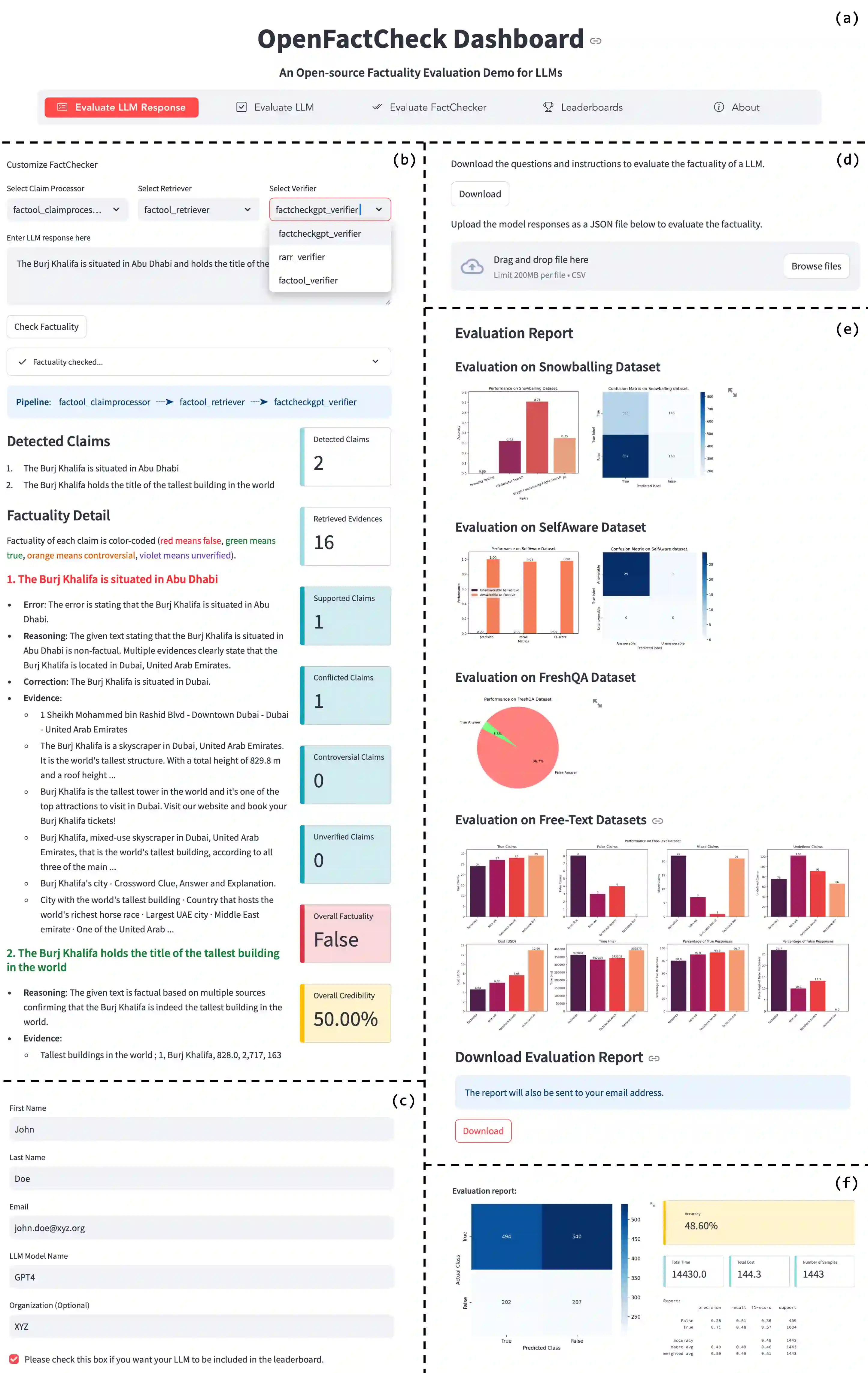 The increased use of large language models (LLMs) across a variety of real-world applications calls for automatic tools to check the factual accuracy of their outputs, as LLMs often hallucinate. This is difficult as it requires assessing the factuality of free-form open-domain responses. While there has been a lot of research on this topic, different papers use different evaluation benchmarks and measures, which makes them hard to compare and hampers future progress. To mitigate these issues, we developed OpenFactCheck, a unified framework, with three modules: (i) RESPONSEEVAL, which allows users to easily customize an automatic fact-checking system and to assess the factuality of all claims in an input document using that system, (ii) LLMEVAL, which assesses the overall factuality of an LLM, and (iii) CHECKEREVAL, a module to evaluate automatic fact-checking systems. OpenFactCheck is open-sourced (https://github.com/mbzuai-nlp/openfactcheck) and publicly released as a Python library (https://pypi.org/project/openfactcheck/) and also as a web service (http://app.openfactcheck.com). A video describing the system is available at https://youtu.be/-i9VKL0HleI.