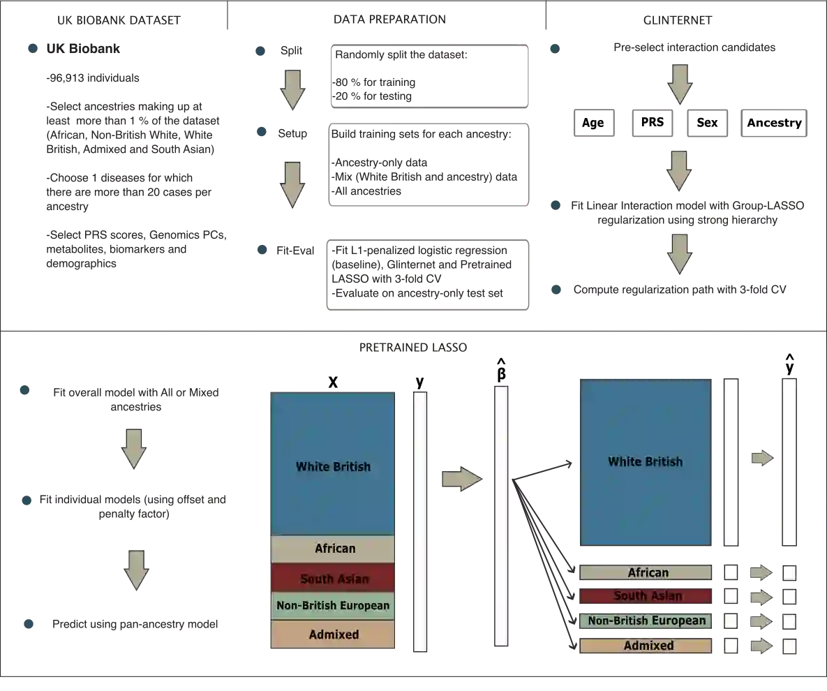 Recent genome-wide association studies (GWAS) have uncovered the genetic basis of complex traits, but show an under-representation of non-European descent individuals, underscoring a critical gap in genetic research. Here, we assess whether we can improve disease prediction across diverse ancestries using multiomic data. We evaluate the performance of Group-LASSO INTERaction-NET (glinternet) and pretrained lasso in disease prediction focusing on diverse ancestries in the UK Biobank. Models were trained on data from White British and other ancestries and validated across a cohort of over 96,000 individuals for 8 diseases. Out of 96 models trained, we report 16 with statistically significant incremental predictive performance in terms of ROC-AUC scores (p-value < 0.05), found for diabetes, arthritis, gall stones, cystitis, asthma and osteoarthritis. For the interaction and pretrained models that outperformed the baseline, the PRS score was the primary driver behind prediction. Our findings indicate that both interaction terms and pre-training can enhance prediction accuracy but for a limited set of diseases and moderate improvements in accuracy