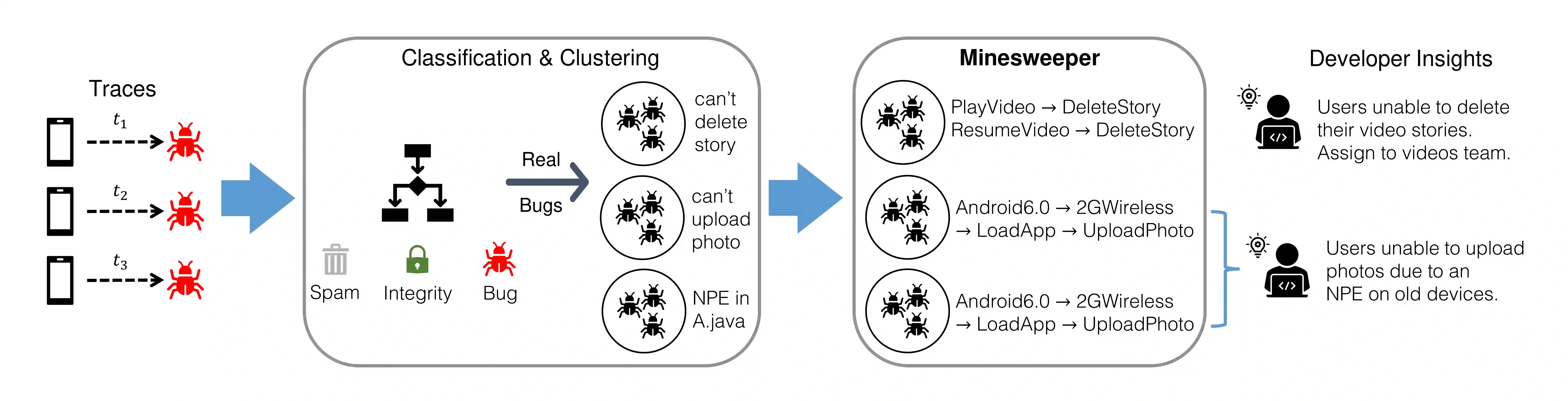 Despite engineering workflows that aim to prevent buggy code from being deployed, bugs still make their way into the Facebook app. When symptoms of these bugs, such as user submitted reports and automatically captured crashes, are reported, finding their root causes is an important step in resolving them. However, at Facebook's scale of billions of users, a single bug can manifest as several different symptoms according to the various user and execution environments in which the software is deployed. Root cause analysis (RCA) therefore requires tedious manual investigation and domain expertise to extract out common patterns that are observed in groups of reports and use them for debugging. We propose Minesweeper, a technique for RCA that moves towards automatically identifying the root cause of bugs from their symptoms. The method is based on two key aspects: (i) a scalable algorithm to efficiently mine patterns from telemetric information that is collected along with the reports, and (ii) statistical notions of precision and recall of patterns that help point towards root causes. We evaluate Minesweeper's scalability and effectiveness in finding root causes from symptoms on real world bug and crash reports from Facebook's apps. Our evaluation demonstrates that Minesweeper can perform RCA for tens of thousands of reports in less than 3 minutes, and is more than 85% accurate in identifying the root cause of regressions.