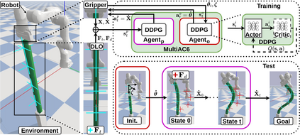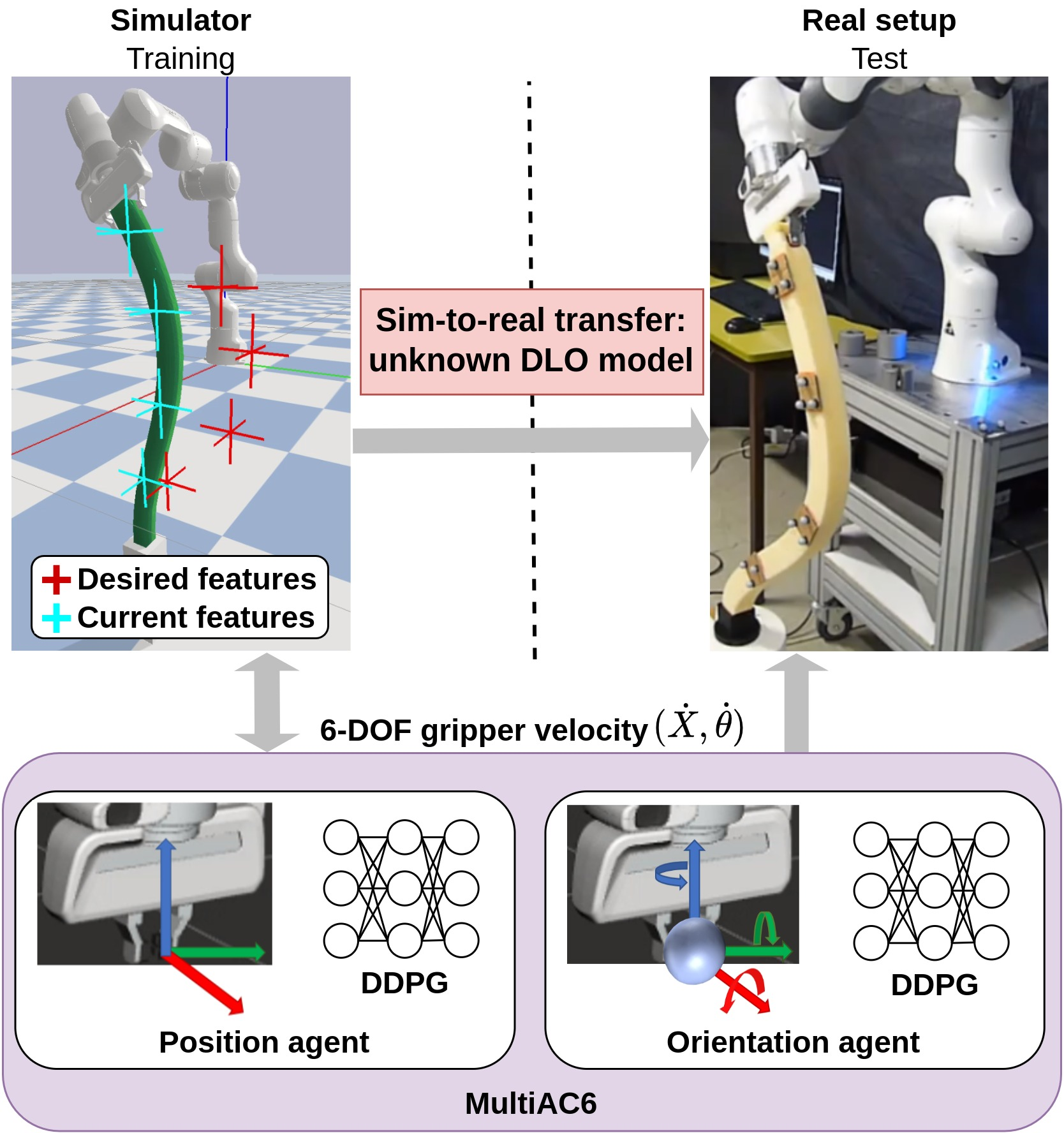 Robotic manipulation of deformable linear objects (DLOs) has great potential for applications in diverse fields such as agriculture or industry. However, a major challenge lies in acquiring accurate deformation models that describe the relationship between robot motion and DLO deformations. Such models are difficult to calculate analytically and vary among DLOs. Consequently, manipulating DLOs poses significant challenges, particularly in achieving large deformations that require highly accurate global models. To address these challenges, this paper presents MultiAC6: a new multi Actor-Critic framework for robot action space decomposition to control large 3D deformations of DLOs. In our approach, two deep reinforcement learning (DRL) agents orient and position a robot gripper to deform a DLO into the desired shape. Unlike previous DRL-based studies, MultiAC6 is able to solve the sim-to-real gap, achieving large 3D deformations up to 40 cm in real-world settings. Experimental results also show that MultiAC6 has a 66\% higher success rate than a single-agent approach. Further experimental studies demonstrate that MultiAC6 generalizes well, without retraining, to DLOs with different lengths or materials.