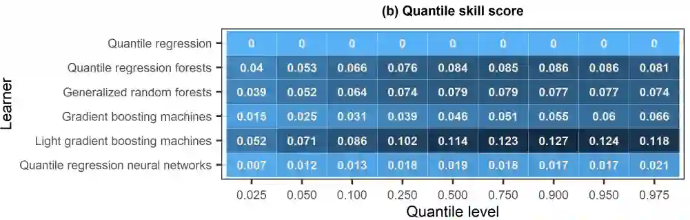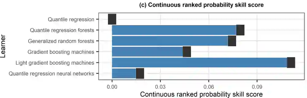To form precipitation datasets that are accurate and, at the same time, have high spatial densities, data from satellites and gauges are often merged in the literature. However, uncertainty estimates for the data acquired in this manner are scarcely provided, although the importance of uncertainty quantification in predictive modelling is widely recognized. Furthermore, the benefits that machine learning can bring to the task of providing such estimates have not been broadly realized and properly explored through benchmark experiments. The present study aims at filling in this specific gap by conducting the first benchmark tests on the topic. On a large dataset that comprises 15-year-long monthly data spanning across the contiguous United States, we extensively compared six learners that are, by their construction, appropriate for predictive uncertainty quantification. These are the quantile regression (QR), quantile regression forests (QRF), generalized random forests (GRF), gradient boosting machines (GBM), light gradient boosting machines (LightGBM) and quantile regression neural networks (QRNN). The comparison referred to the competence of the learners in issuing predictive quantiles at nine levels that facilitate a good approximation of the entire predictive probability distribution, and was primarily based on the quantile and continuous ranked probability skill scores. Three types of predictor variables (i.e., satellite precipitation variables, distances between a point of interest and satellite grid points, and elevation at a point of interest) were used in the comparison and were additionally compared with each other. This additional comparison was based on the explainable machine learning concept of feature importance. The results suggest that the order from the best to the worst of the learners for the task investigated is the following: LightGBM, QRF, GRF, GBM, QRNN and QR...