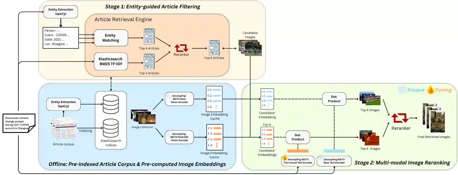 翻译:从自然语言描述中检索图像是计算机视觉与自然语言处理交叉领域的核心任务,在搜索引擎、媒体归档和数字内容管理等领域具有广泛应用。然而,由于查询语句的模糊性、语境依赖性、语言表达的多样性以及可扩展性需求,现实场景中的图文检索仍面临挑战。本研究提出一种轻量级两阶段检索框架,通过事件中心实体提取技术,从现实世界图像描述中融合时序与上下文信息。第一阶段基于显著实体,采用BM25算法进行高效候选图像筛选;第二阶段运用BEiT-3模型捕获深度多模态语义特征并对结果重排序。在OpenEvents v1基准测试中,本方法实现了0.559的平均精度均值,显著超越现有基线模型。实验结果表明,结合事件引导过滤机制与长文本视觉语言建模,能够在复杂现实场景中实现精准高效的图像检索。代码已开源:https://github.com/PhamPhuHoa-23/Event-Based-Image-Retrieval