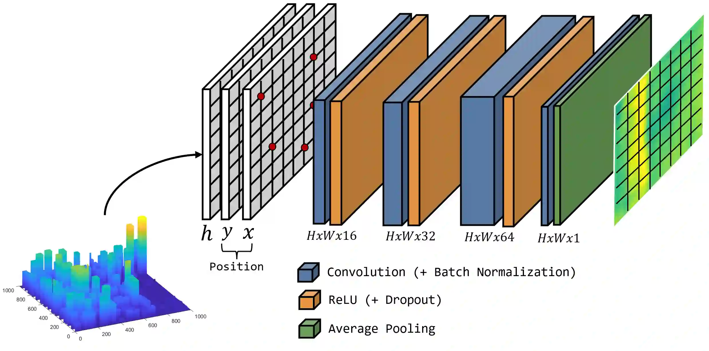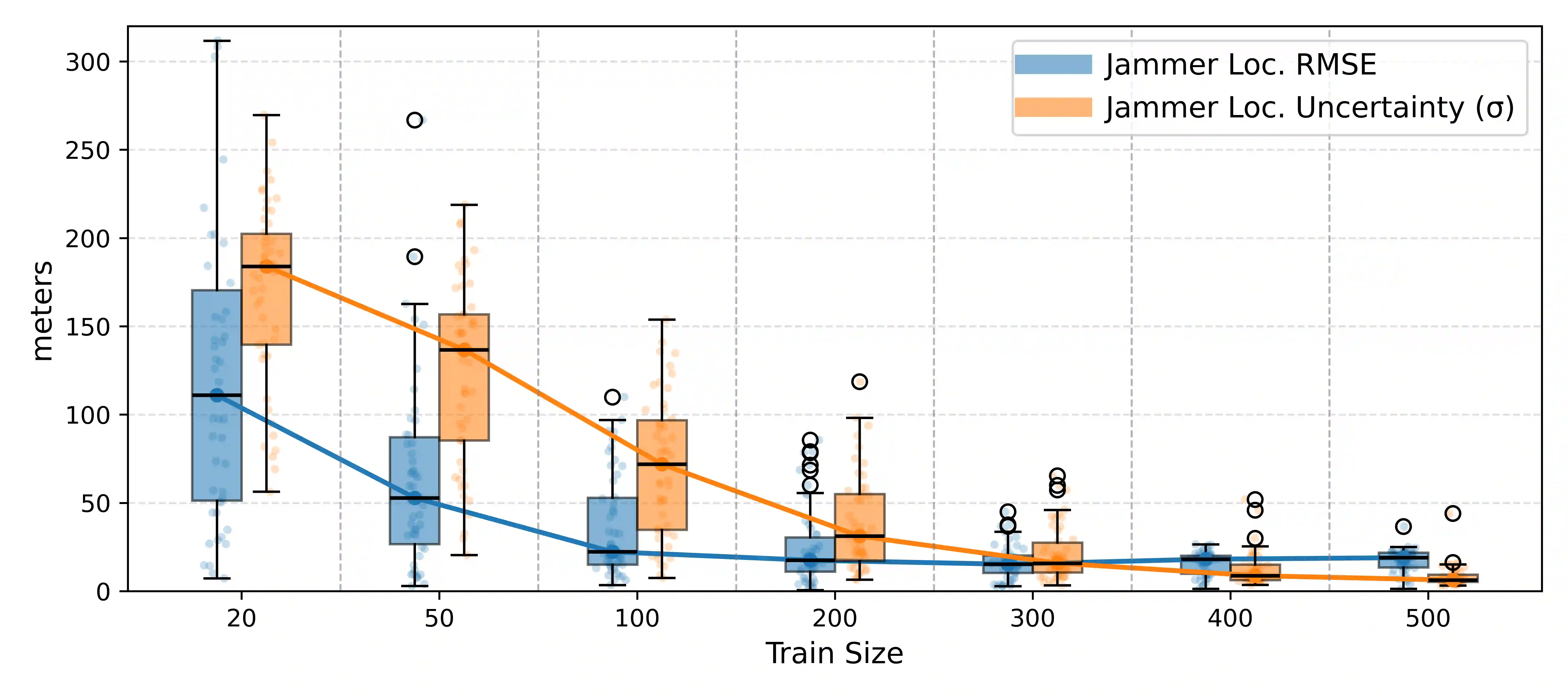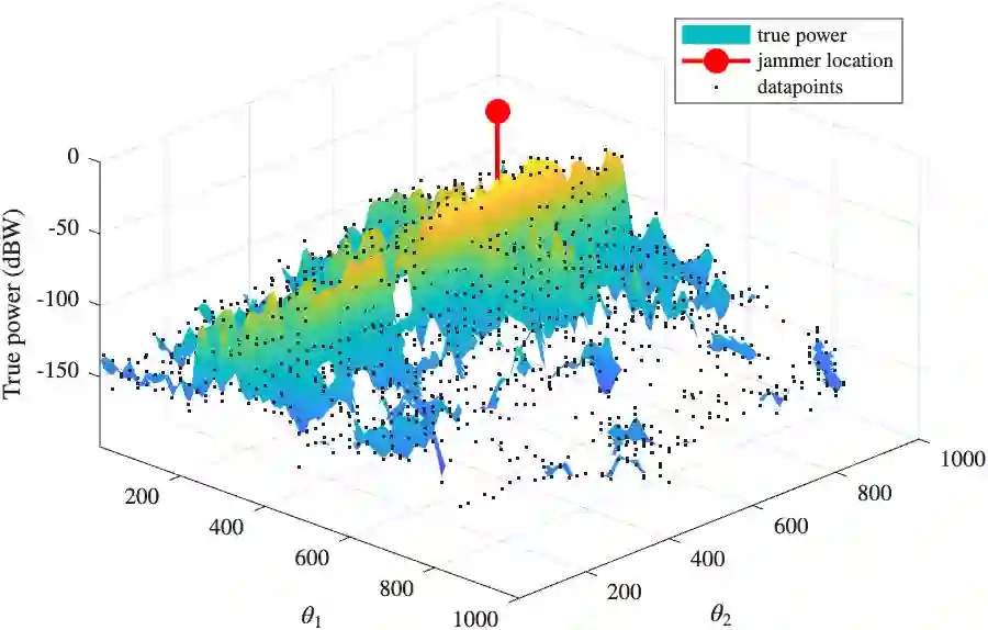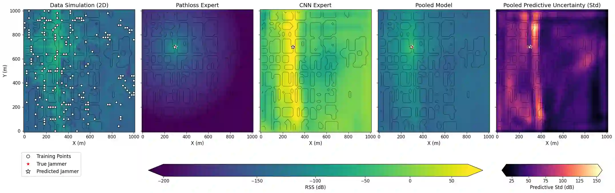 翻译:全球导航卫星系统(GNSS)信号易受干扰,尤其是在多径效应和阴影效应导致接收功率失真的城市区域。以往基于数据驱动的方法虽能实现合理的定位,但由于空间上下文信息有限,对接收信号强度(RSS)场的重构效果较差。本文提出一种混合贝叶斯混合专家框架,通过对数线性池化融合物理路径损耗(PL)模型与卷积神经网络(CNN)。路径损耗专家确保物理一致性,而CNN则利用建筑高度图捕捉城市传播效应。通过拉普拉斯近似的贝叶斯推断,可同时获得干扰源位置与RSS场的后验不确定性。基于城市射线追踪数据的实验表明:随着训练点数量增加,定位精度提升且不确定性降低;不确定性主要集中于干扰源附近及传播最敏感的城市峡谷区域。