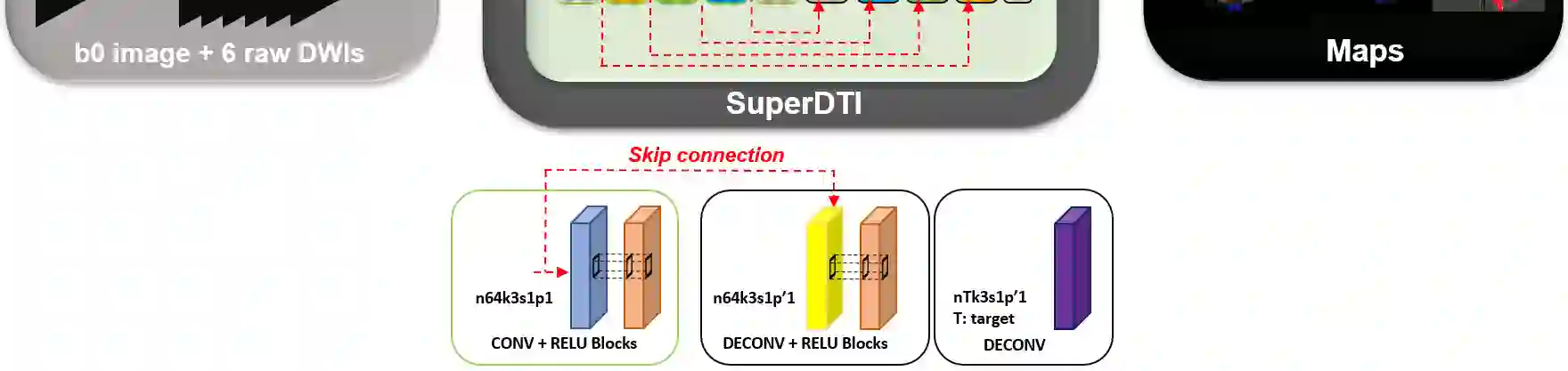 Purpose: To propose a deep learning-based reconstruction framework for ultrafast and robust diffusion tensor imaging and fiber tractography. Methods: We propose SuperDTI to learn the nonlinear relationship between diffusion-weighted images (DWIs) and the corresponding tensor-derived quantitative maps as well as the fiber tractography. Super DTI bypasses the tensor fitting procedure, which is well known to be highly susceptible to noise and motion in DWIs. The network is trained and tested using datasets from Human Connectome Project and patients with ischemic stroke. SuperDTI is compared against the state-of-the-art methods for diffusion map reconstruction and fiber tracking. Results: Using training and testing data both from the same protocol and scanner, SuperDTI is shown to generate fractional anisotropy and mean diffusivity maps, as well as fiber tractography, from as few as six raw DWIs. The method achieves a quantification error of less than 5% in all regions of interest in white matter and gray matter structures. We also demonstrate that the trained neural network is robust to noise and motion in the testing data, and the network trained using healthy volunteer data can be directly applied to stroke patient data without compromising the lesion detectability. Conclusion: This paper demonstrates the feasibility of superfast diffusion tensor imaging and fiber tractography using deep learning with as few as six DWIs directly, bypassing tensor fitting. Such a significant reduction in scan time may allow the inclusion of DTI into the clinical routine for many potential applications.